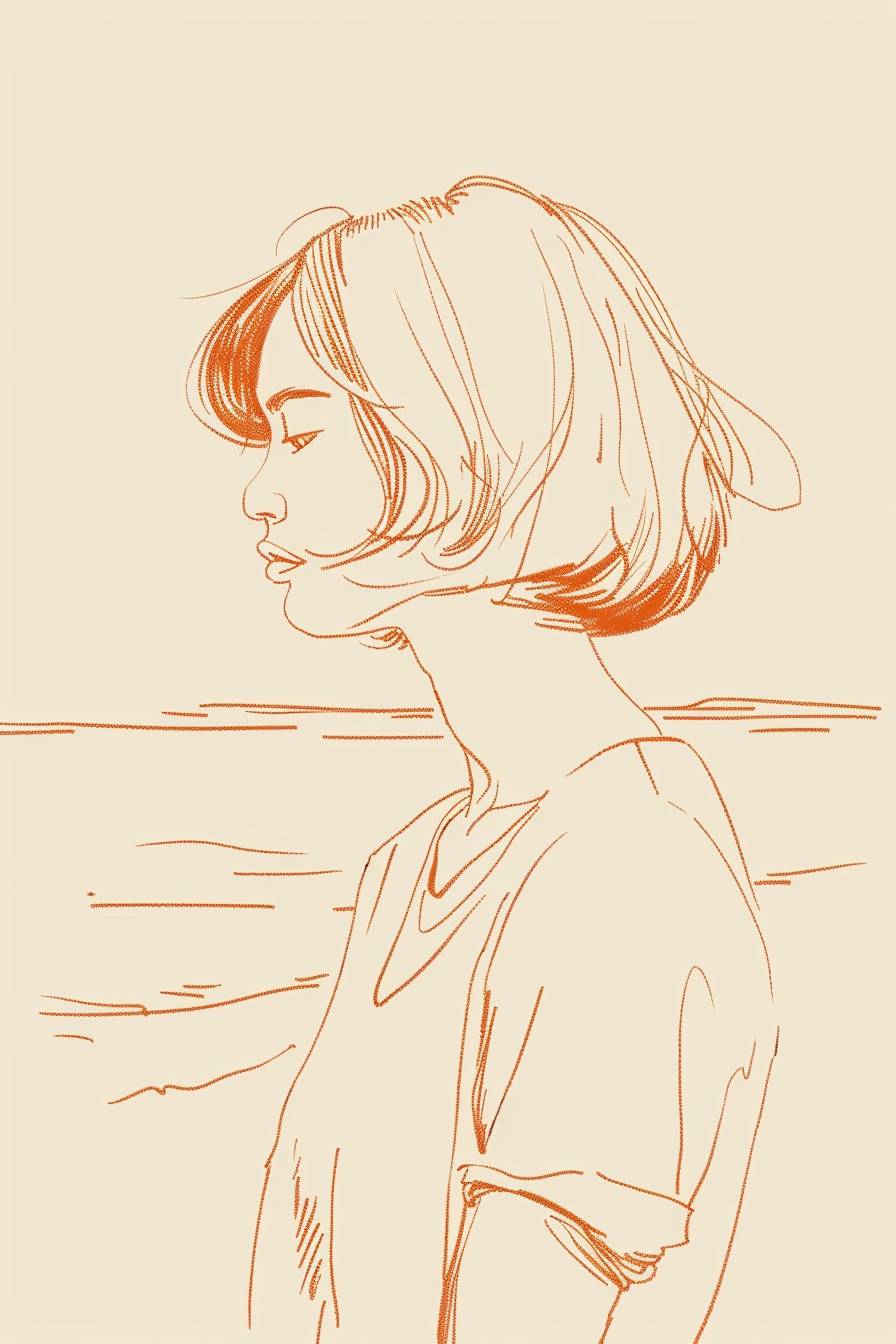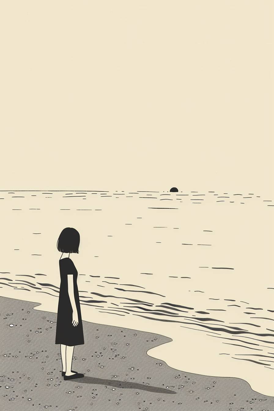 the short hair girl feeling is so lonely on the beach in 1970s, lineal illustration, minimal art style --ar 2:3 --v 6.0