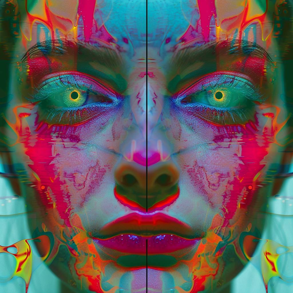 대담하고 아름다운 클로즈업, 초상 사진, 얼굴 페인트, 도자기 인형, 수직 글리치 아트, 신성한 기하학, 생생한 색상, 대칭, 미니멀리즘