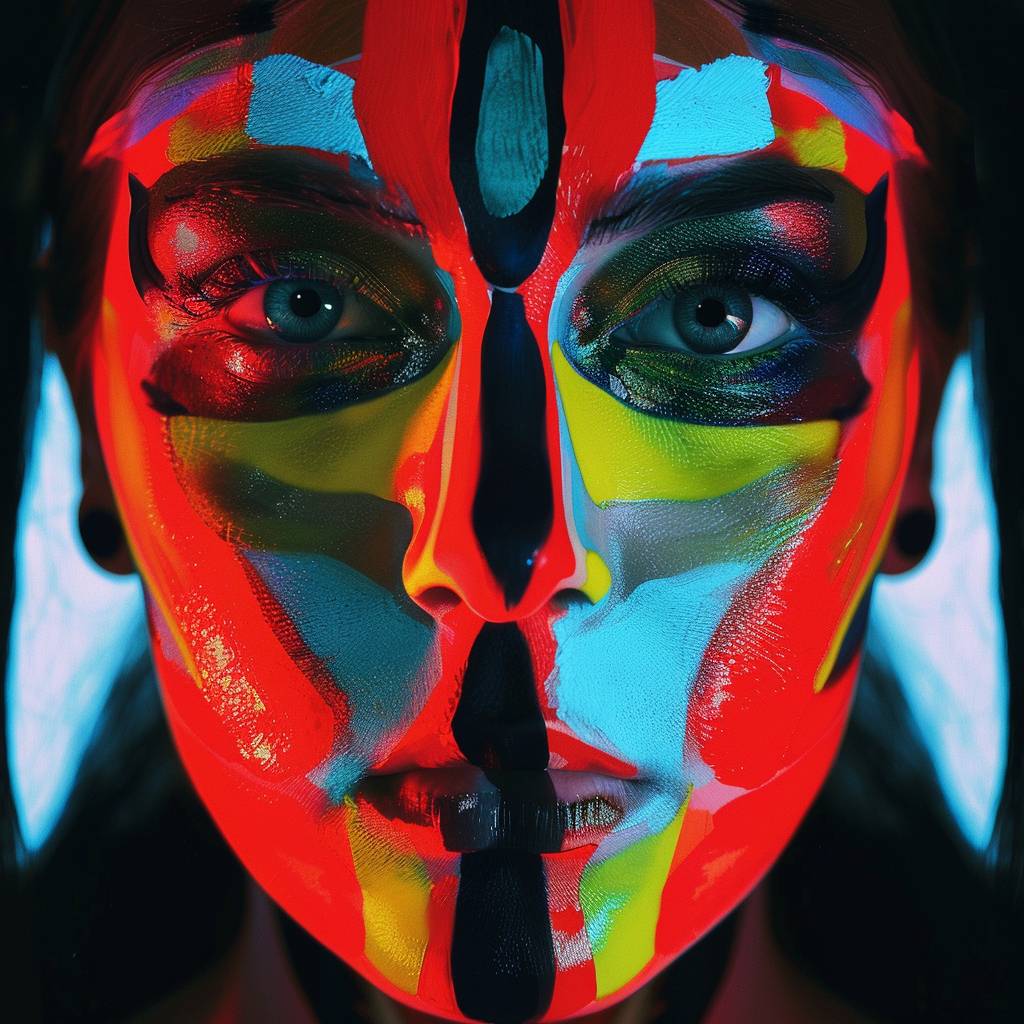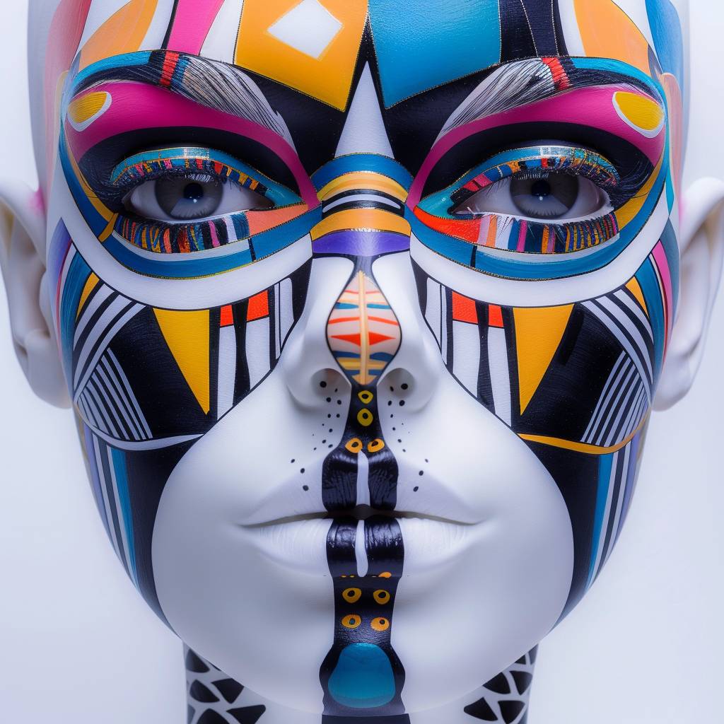 bold and beautiful Close-up, portrait photo, face paint, porcelain doll, vertical glitch art, sacred geometry, vivid colors, symmetrical, minimalism --v 6.0