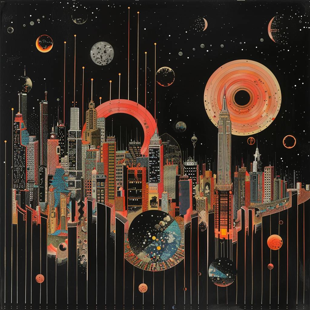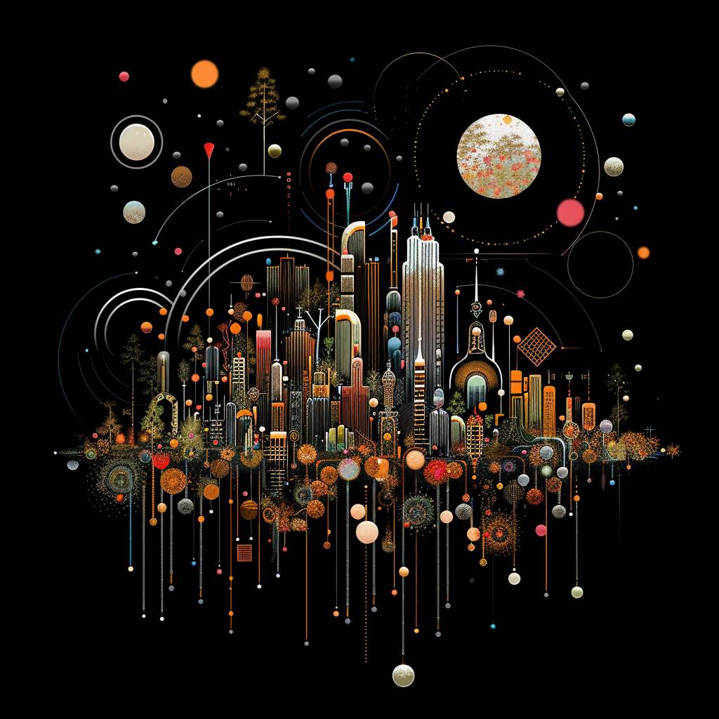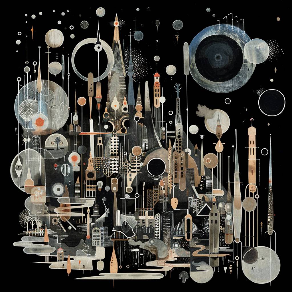[주제]의 초상화, 소설 비주얼 스타일, 검은 배경, 우주를 나타내는 떠 있는 형태와 형태의 배열, 단색 대비의 음영으로 큰 기하학적 원, 곳곳에 흩어져 있는 작은 검은 점. 이러한 형태 사이에는 작은 건물, 나무 및 기타 도시 요소로 구성된 미니어처 도시 풍경이 있습니다. 전반적인 효과는 기발하고 환상적이어야 하며, 꿈 같은 느낌을 주는 초현실적인 품질을 가져야 합니다.