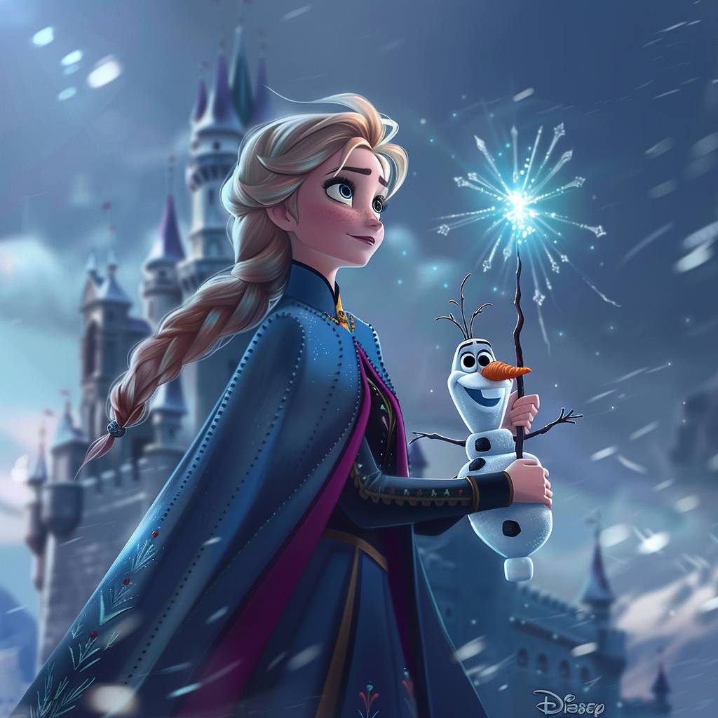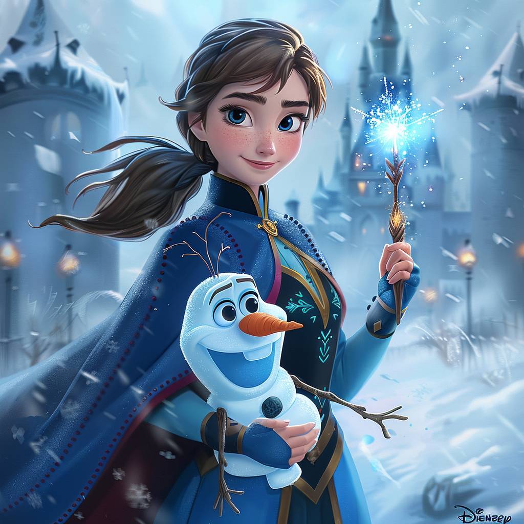 The image of Aisha in the movie "Frozen", Aisha holding Olaf, holding a magic wand, wearing a blue cape, Disney style, the background of the snow castle, excellent lighting, detail, realistic --v 6.0