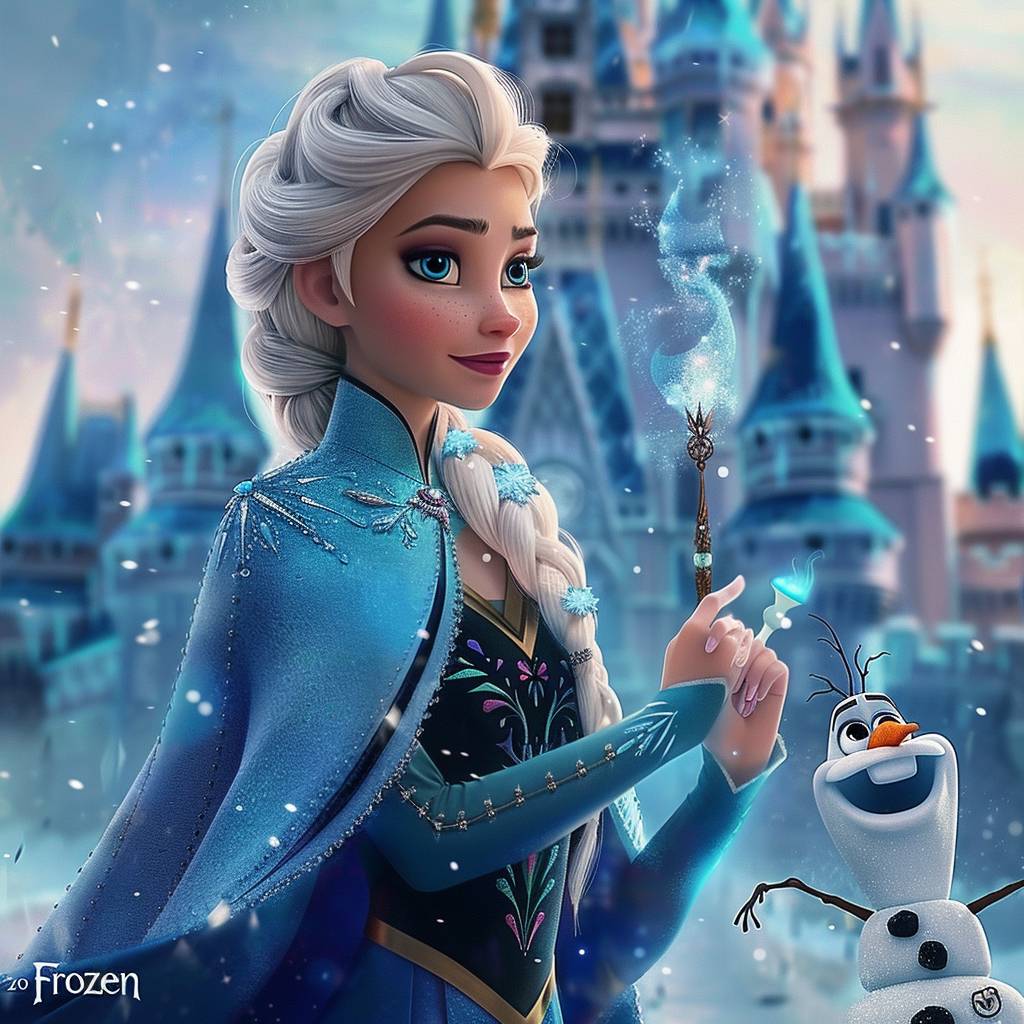 영화 '겨울왕국'의 아이샤 이미지, 아이샤가 올라프를抱고 있고, 마법 지팡이를 들고 있으며, 파란 망토를 입고, 디즈니 스타일, 배경은 눈의 성, 훌륭한 조명, 세부 사항, 사실적