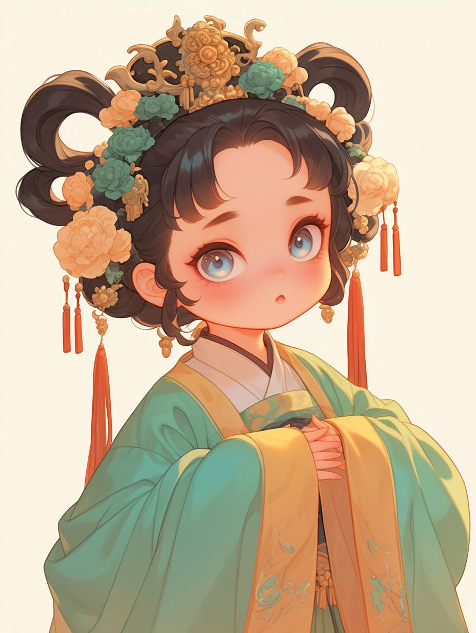 당나라 소녀, 귀여운 만화 벡터, 아기 뚱뚱이 얼굴, 모란 머리 장식, 부드러운 조명과 꿈 같은 분위기, 청록색과 연한 노란색, 둔황 의상, 전통 중국 문화의 매력.