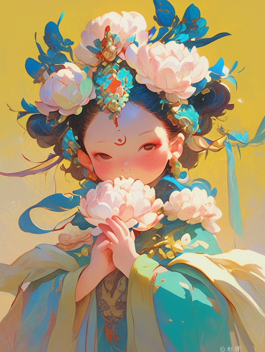 Tang Dynasty girl,The cute cartoon-vector ,baby fat with chubby face ,peony headdress ,soft lighting and a dreamy atmosphere ,urquoise green and light yellow, Dunhuang costume ,the charm of traditional Chinese culture --ar 3:4 --niji 6