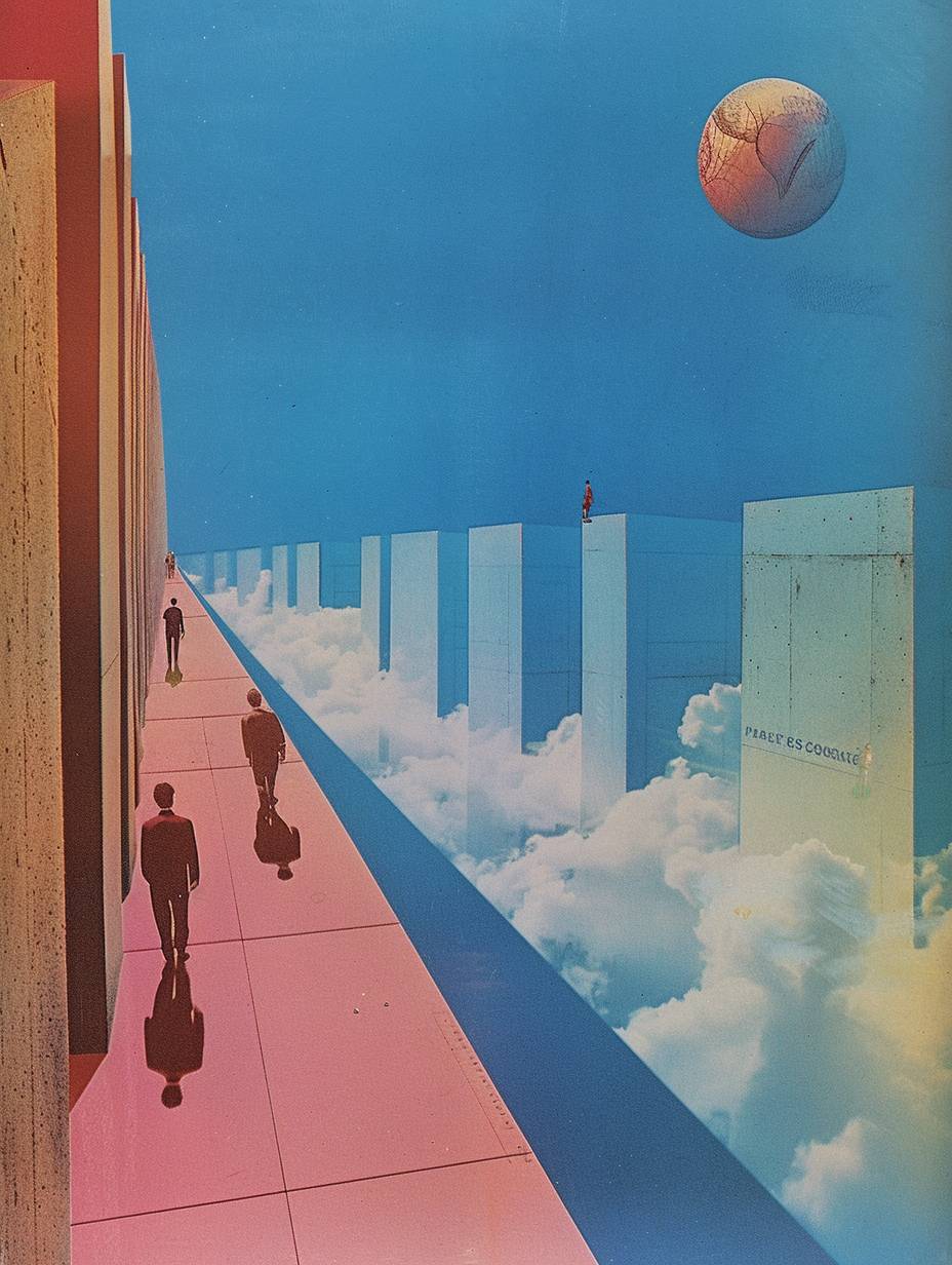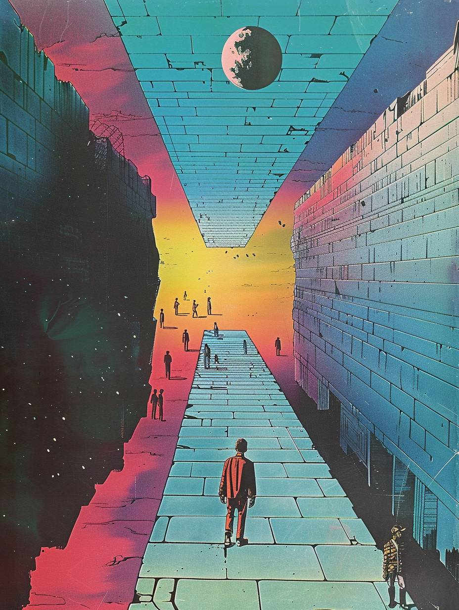 1980년대 미니멀한 잡지 광고, 단어를 통해 세상을 보여줍니다. 사람들은 어디에나 있지만, 계속 변화하는 공간을 방황하고 있습니다. 미니멀한 빈티지, 포스트모던, 강렬하고 힘찬, 앨범 표지, 스톰 토고슨 디자인, 피터 블레이크 촬영, 미니멀한 만화 스타일, 다채로운 모에부스 | 1980년대 | 후지필름 Natura 1600 35mm 핸드헬드 카메라로 촬영. 이미지는 640i 해상도로 이 시대의 표준 품질을 모방해야 합니다.