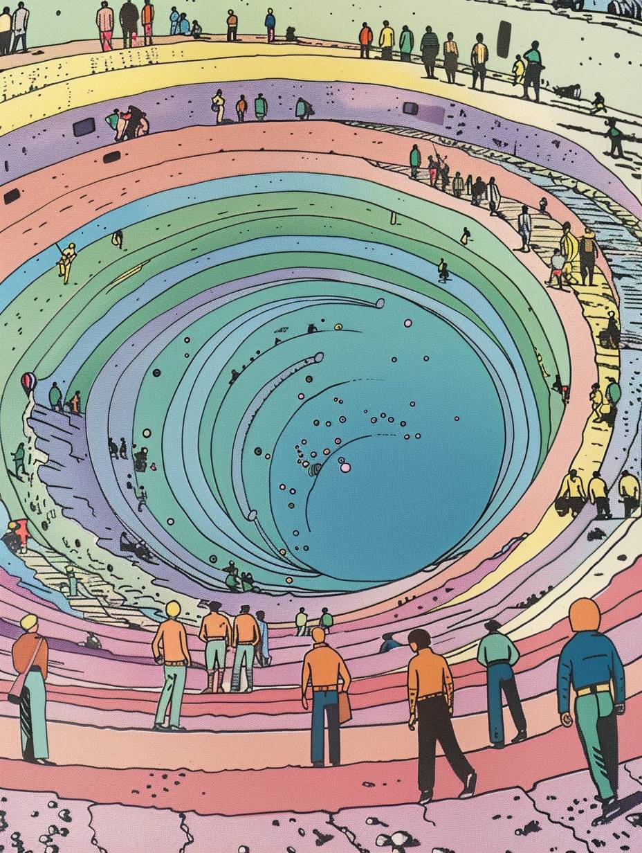 1980s minimal magazine ad of world through words, people are everywhere, but wandering through an everchanging space, minimalist vintage, post modern, intense, powerful, album cover, designed by Storm Thorgerson and taken by Peter Blake, in the style of minimalist cartooning, colorful moebius | 1980s | shot on a fujifilm natura 1600 35 mm handheld camera. The image should be in 640i resolution, emulating that standard quality of that era. --ar 3:4 --v 6.0