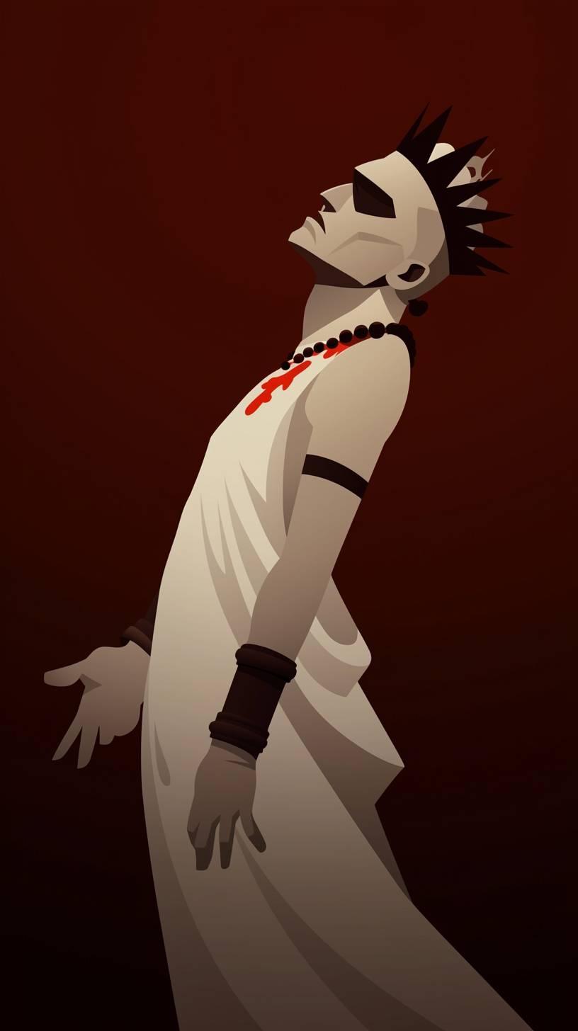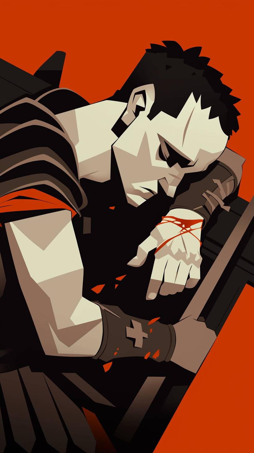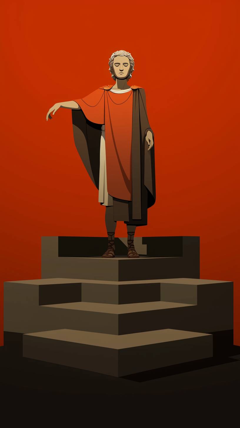 율리우스 카이사르, 시간 없는 신화의 스타일로, 헬레니즘 예술, 진한 적색과 흰색, 두꺼운 선, 높은 대비, 듀오톤