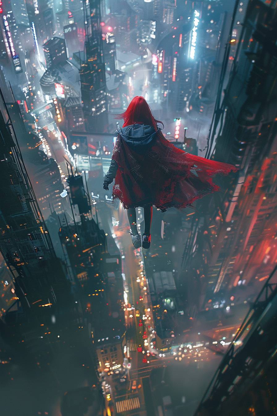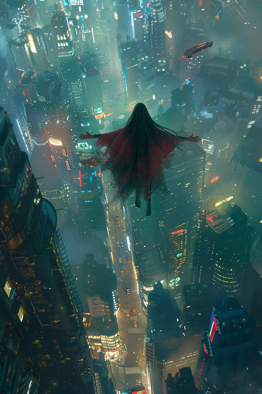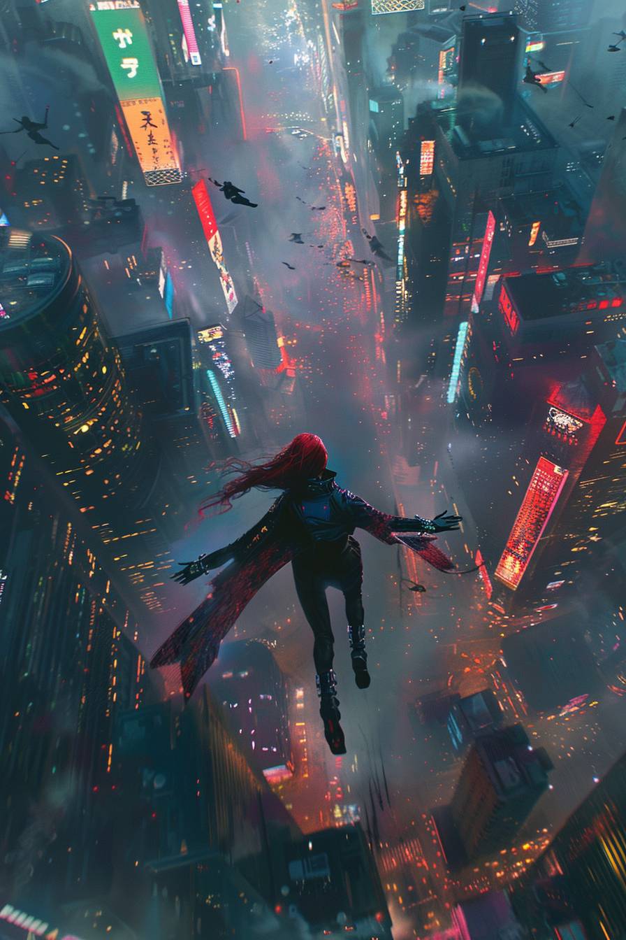 Flying through the air above the city at night is a CYBERPUNK WITCH, in the style of OILPAINTCORE, FUTURISTIC VIBE, NEONOIR --ar 2:3 --stylize 300 --v 6.0