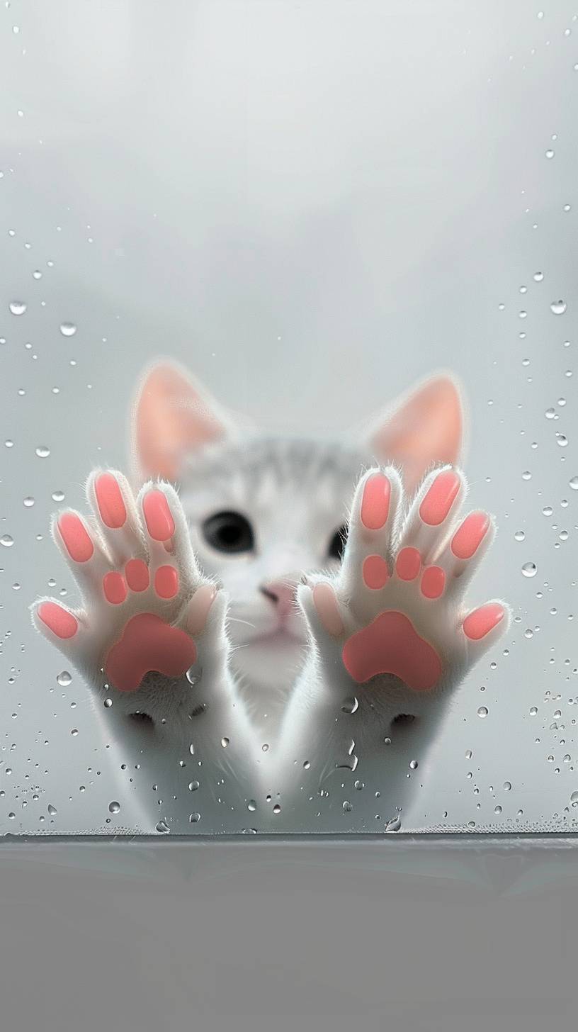 Through frosted glass, I saw a cute cat face with a hazy texture, with two pink claws protruding from below. Simple background and cartoon style. Featuring white and gray, adopting minimalist design. A close-up of only one claw with a blurry effect to increase depth --ar 9:16 --s 50 --v 6.0 --style raw