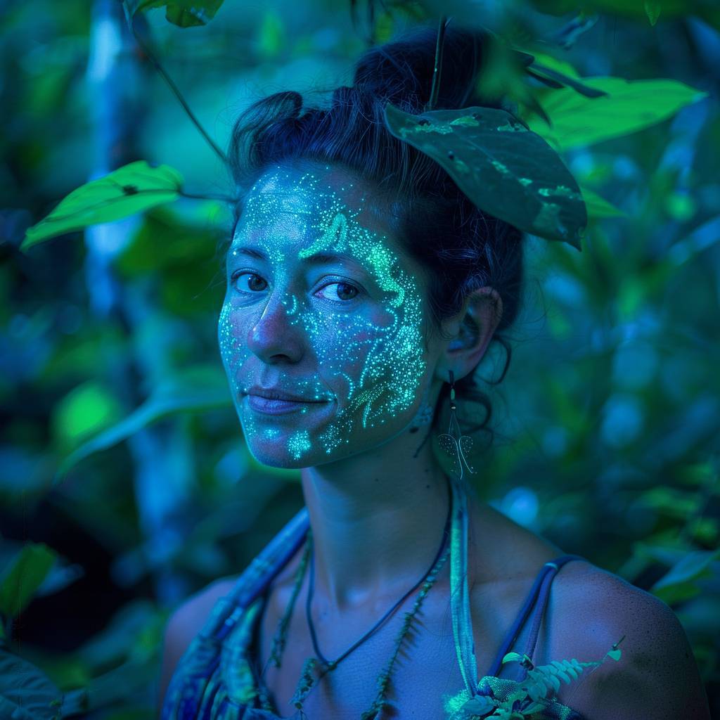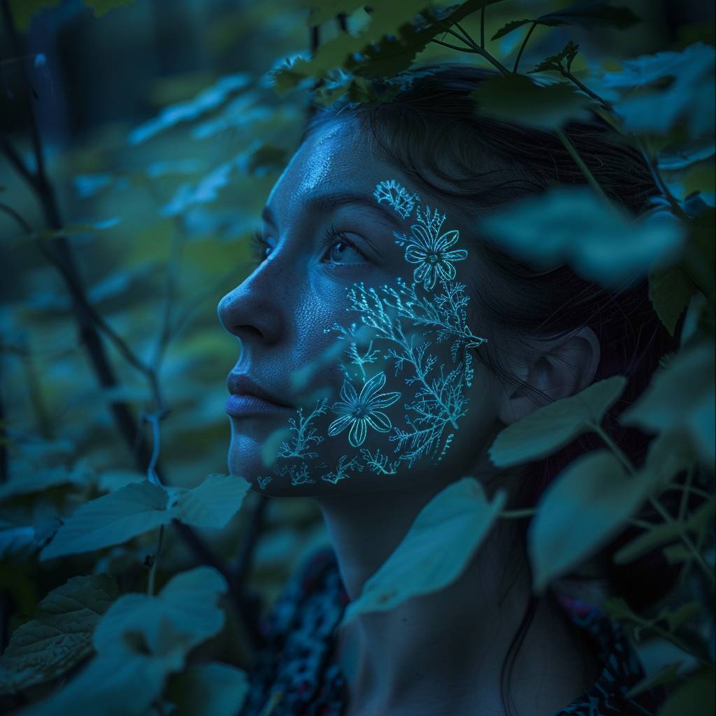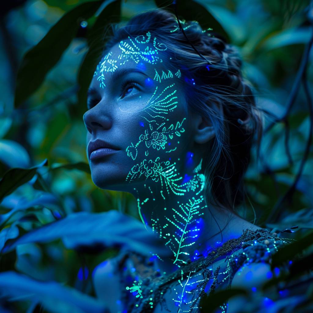 portrait of serene woman in a mystical forest at blue hour, surrounded by lush, vibrant green foliage, with intricate patterns of bioluminescent plants like Mycena chlorophos mushrooms and Dinoflagellate algae etched onto her skin, ethereal blue glow on her, contemplative and peaceful expression, harmonious connection between humanity and nature, enchantment and otherworldly beauty atmosphere, sharp focus on the woman and a blurred background --v 6.0