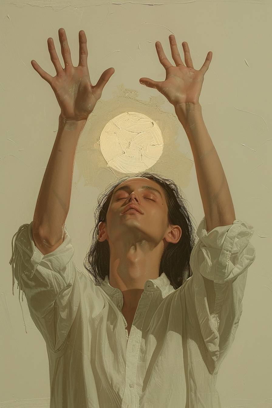 태양을 향해 손을 내미는 모습을 담은 예술 포스터로, 깨끗한 선과 미니멀한 디자인에 중점을 두며 부드러운 파스텔 톤을 사용했습니다.