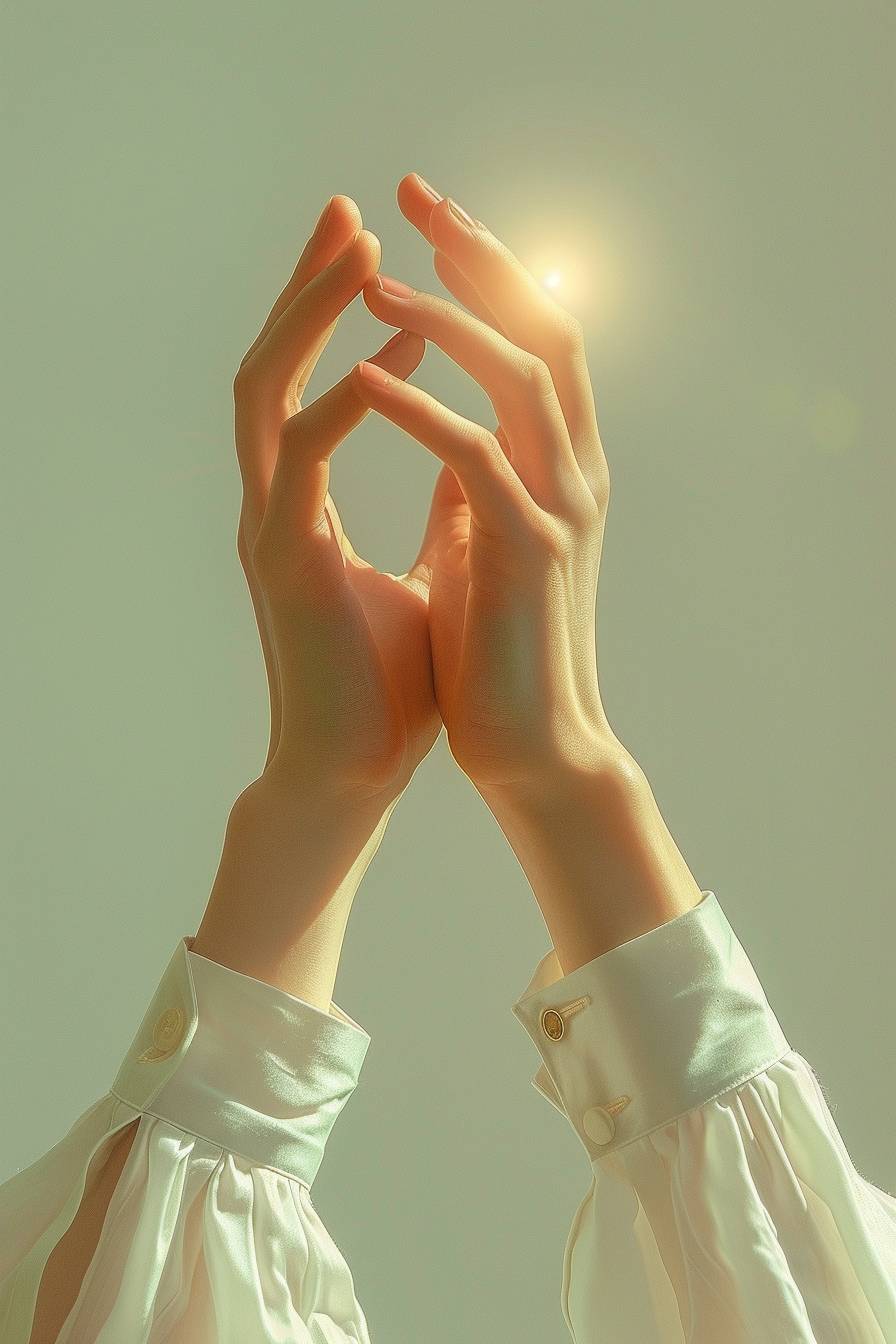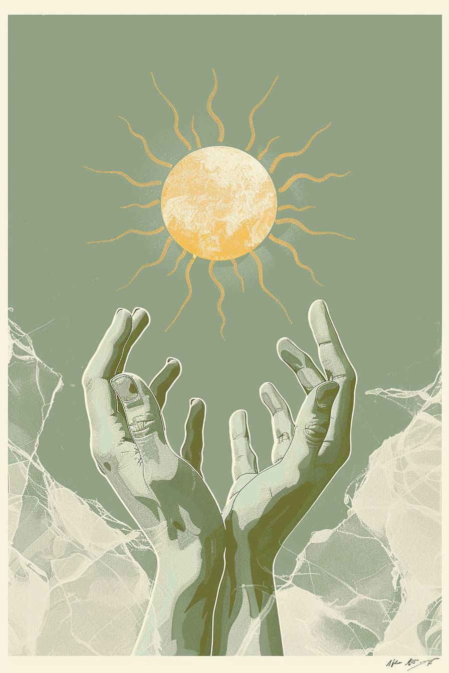 An artistic poster depicting hands reaching towards the sun, with a focus on clean lines and a minimalist design, using soft pastel tones --no bold colors, no abstract shapes --ar 2:3 --stylize 500 --v 6.0