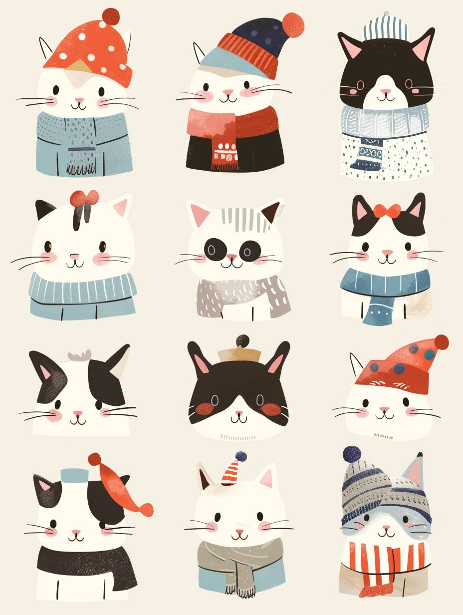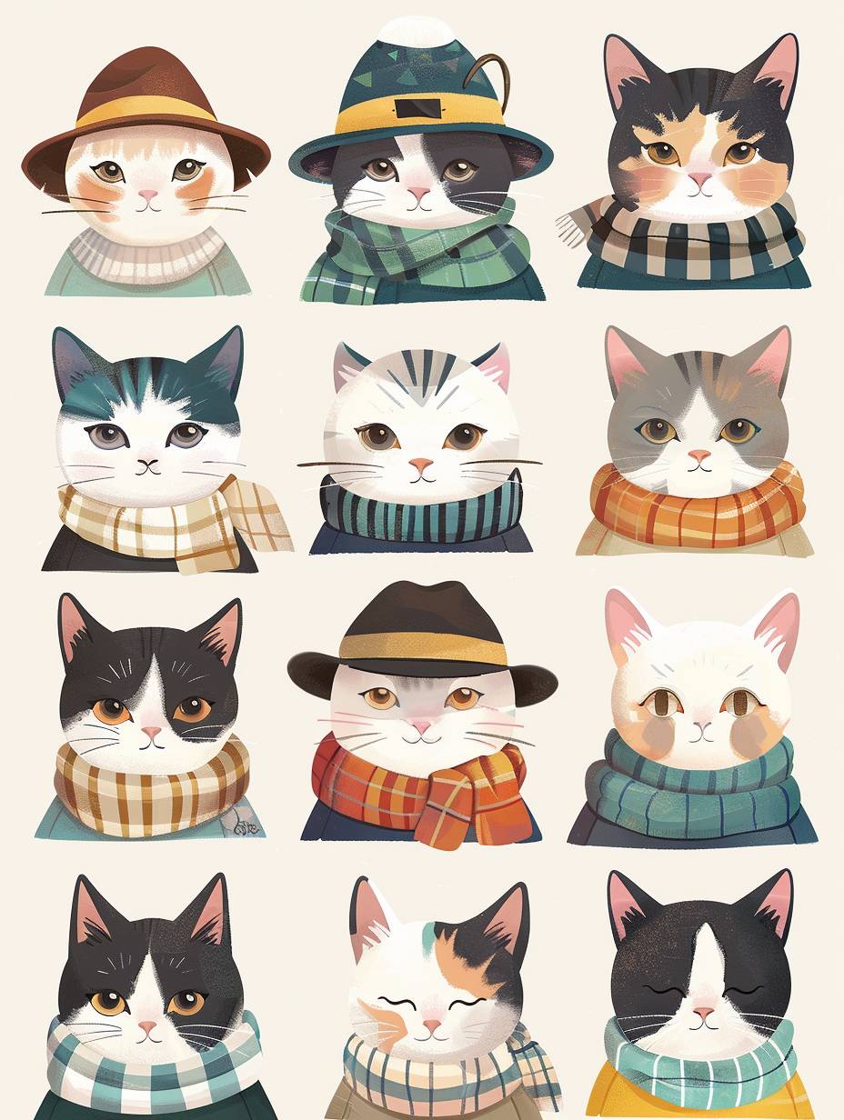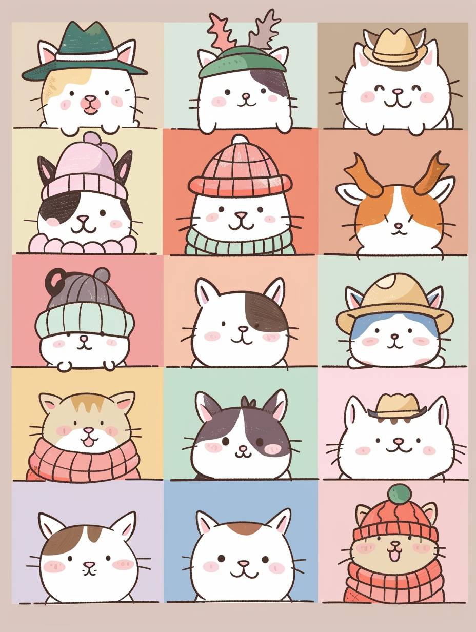 A grid of cartoon cattle wearing different outfits, such as hats and scarves, arranged in rows on the page. The illustration style is cute with soft colors and simple shapes. Each cat has an expression that reflects its character or mood, from happy to sad. There's space between each row for more characters if there were many cats wearing various . This design would be suitable for a sticker sheet where they could become part of your daily makeup routine., --ar 3:4 --v 6.0