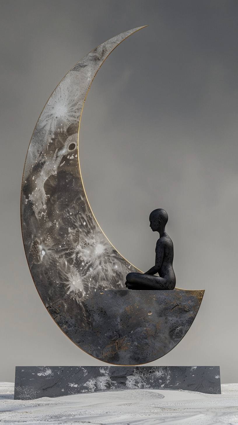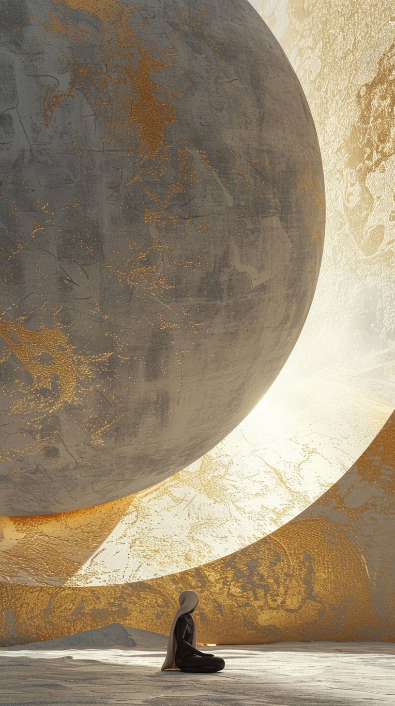 초현실주의, 미니멀리스트 스타일, 하늘에 거대한 초승달, 그 위에서 명상하는 승려, 미니멀 추상 스타일, 8K 해상도, 1200mm 렌즈로 촬영, 연한 회색과 금색, 강한 그림자, 동양 이미지, 순수한 배경.
