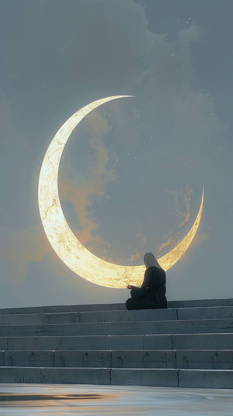 초현실주의 미니멀리즘 스타일, 하늘의 거대한 초승달, 명상하는 스님