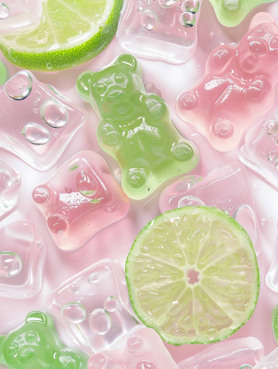 A closeup of gummy bear ice cubes in pink and green colors, lime slice,glistening with water droplets and creating an artistic pattern. The background has soft pastel hues, providing a serene ambiance for the candy-themed wallpaper. High resolution, high quality. --ar 3:4 --personalize qwmtejw --stylize 50 --v 6.0