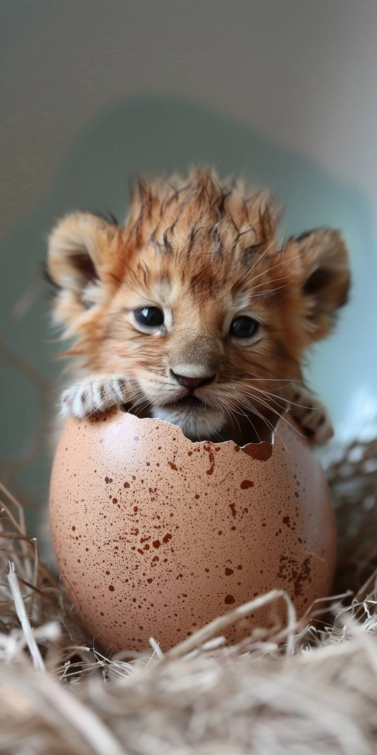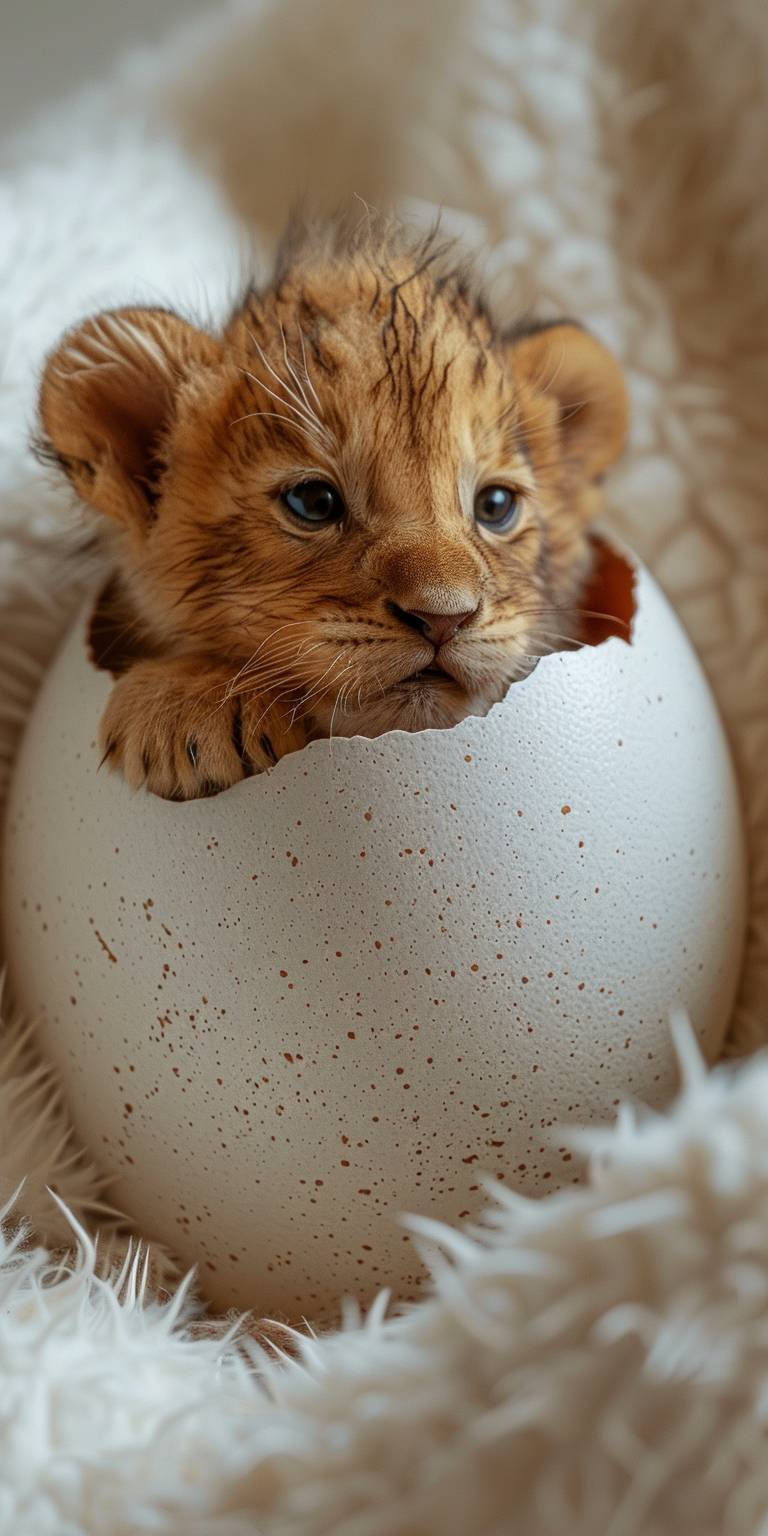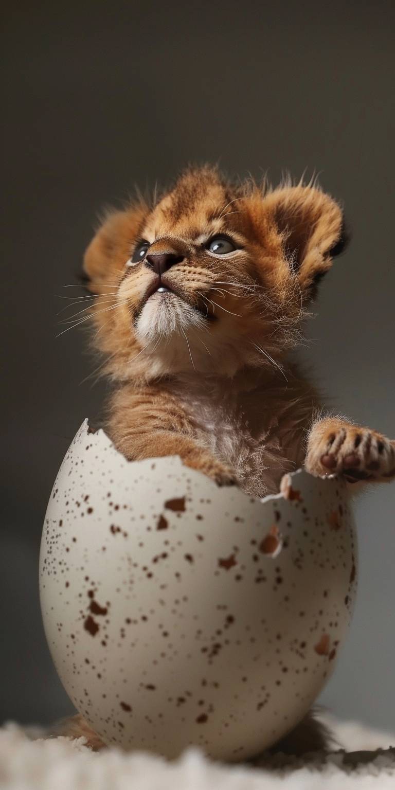 A small tiny lion is hatching from inside the egg. White background,32KUHD --ar 1:2 --style raw --stylize 250 --v 6.0
