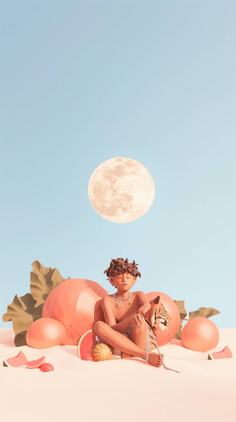 In the deep blue sky hangs a golden round moon, below is the sandy beach, all planted with endless green watermelons. Among them is a boy of eleven or twelve years old, wearing a silver ring around his neck, holding a steel fork, stabbing a tiger. --sref 577817196 --ar 9:16 --v 6.0
