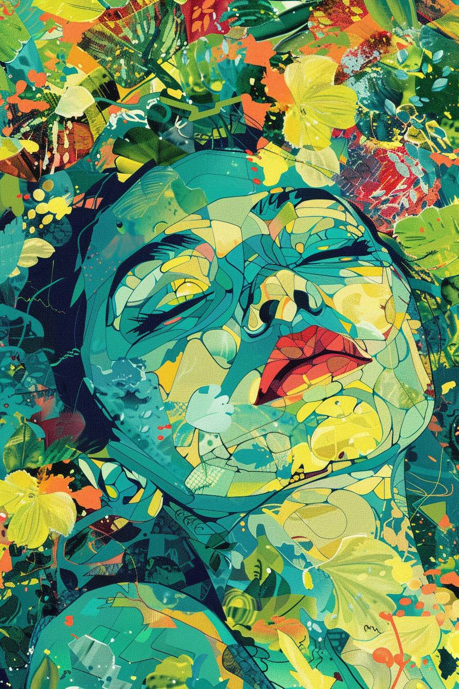 Illustrations en 2D, palette de couleurs vives et contrastées, mélange de teintes : vertes, jaunes, bleues et rouges. Style mosaïque, ambiance dynamique et expressive. --ar 2:3 --v 6.0