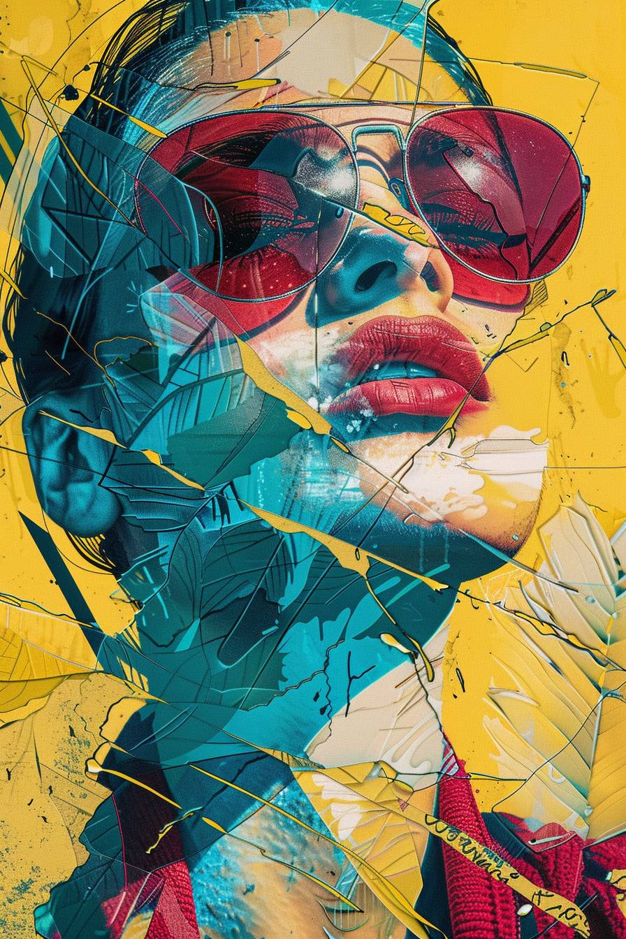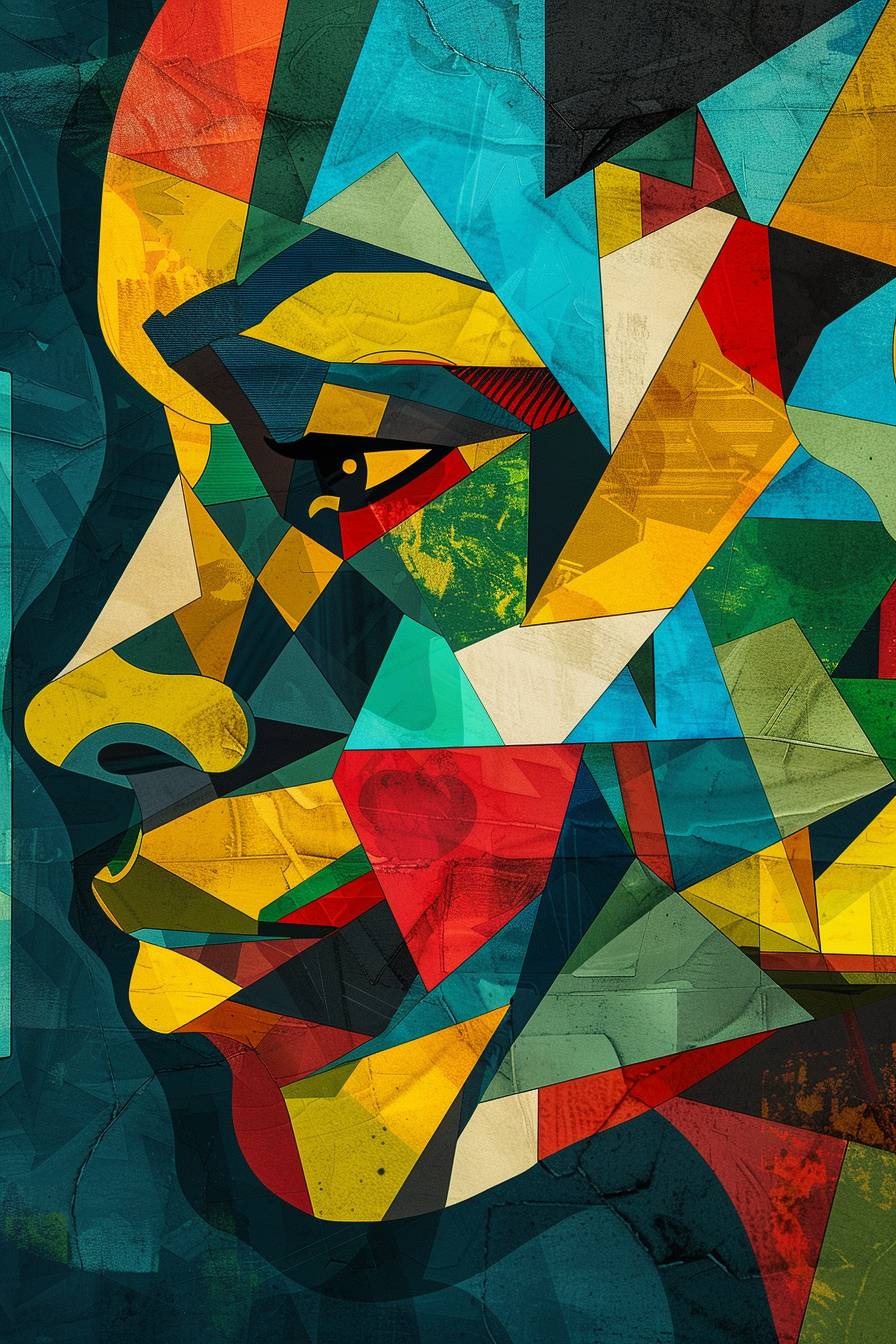 역동적이고 표현력이 풍부한 모자이크 스타일의 일러스트, 생생한 색상 사용.
