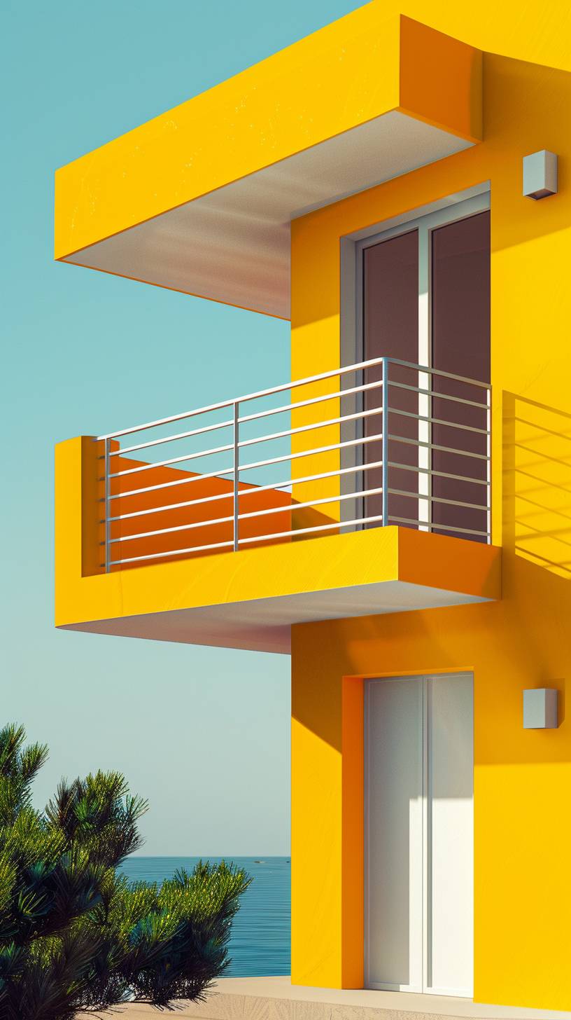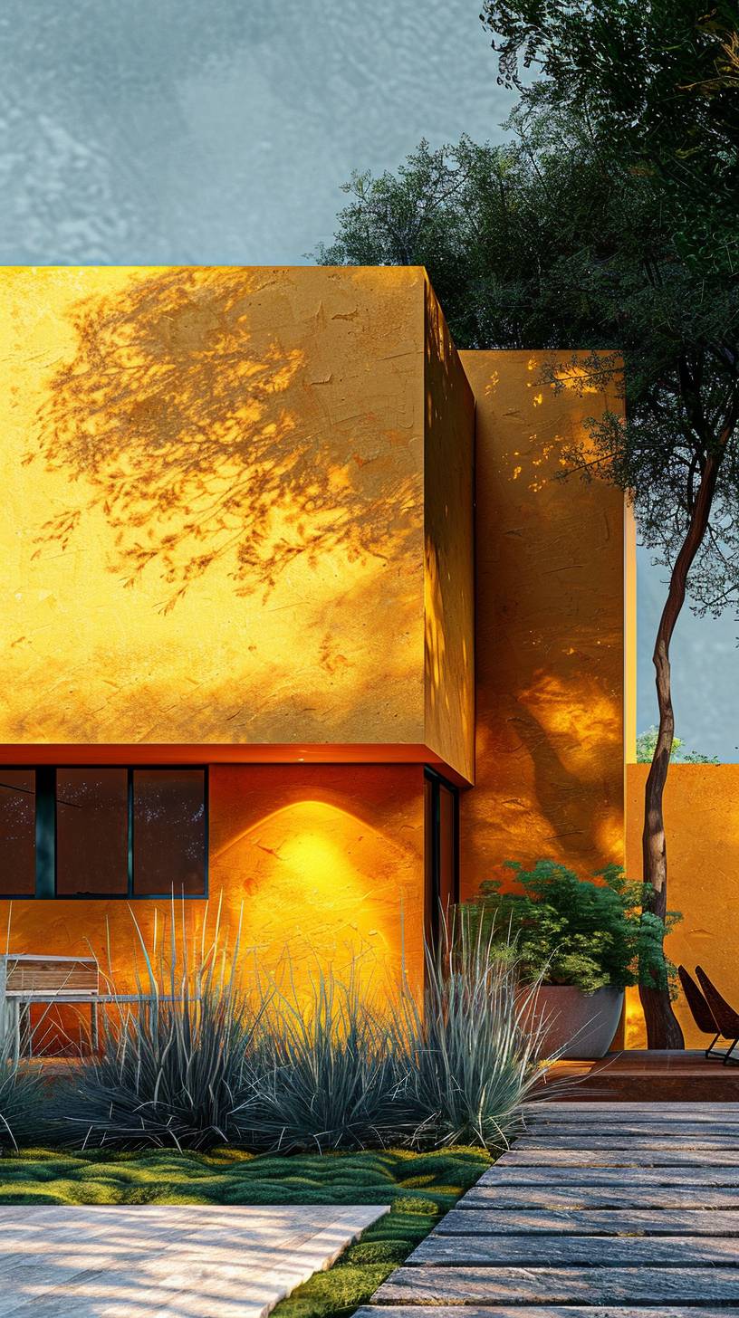 건축 사진, 사실적, 정면 현대 집 유형, 노란 벽, 벽에 있는 빛, 맑은 날, 극단적인 클로즈업 샷, 미니멀리즘