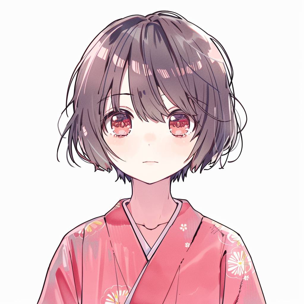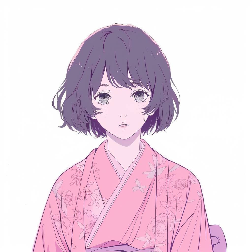 핑크색 기모노를 입은 짧은 머리 소녀, 구 애니메이션 스타일.