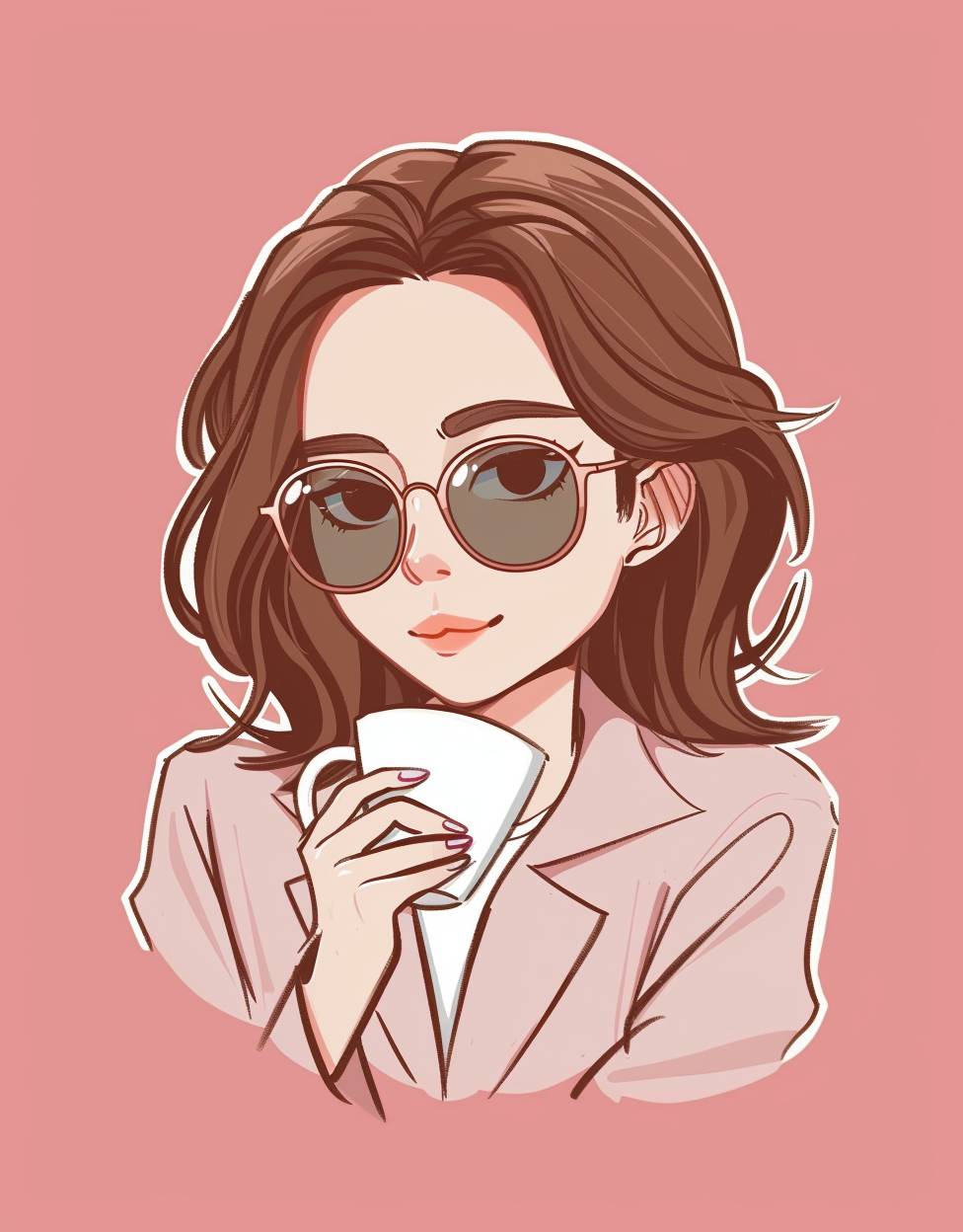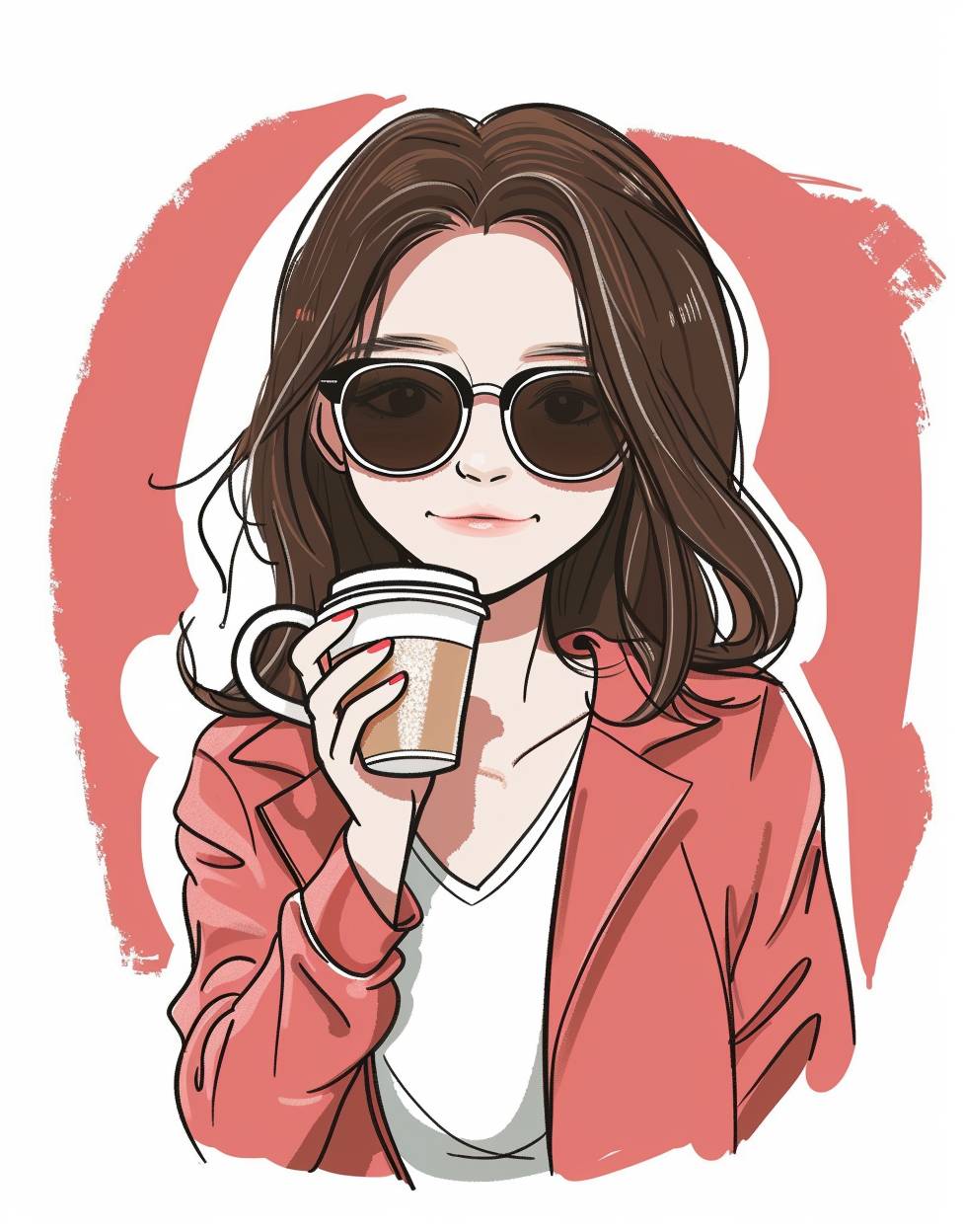 A cute female Asian lawyer with brown hair and pink , wearing sunglasses to drink coffee. She has an exaggerated expression while drinking tea. A simple cartoon style drawing with bright colors. The background color should be light red or pink, adding fun to the illustration. There is no other character in front of it, in the style of Quentin Blake . --ar 87:112 --style raw --v 6.0