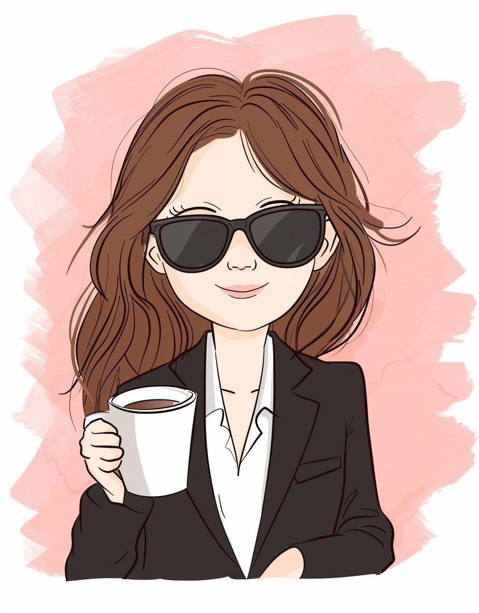 갈색 머리와 분홍색을 입고, 선글라스를 쓰고 커피를 마시는 귀여운 아시아 여성 변호사. 차를 마실 때 과장된 표정을 지니고 있습니다. 단순한 만화 스타일의 그림이며 밝은 색상으로 그려졌습니다. 배경 색상은 연한 빨간색이나 분홍색으로 이 일러스트에 재미를 더합니다. 앞에는 다른 캐릭터가 없고, 퀜틴 블레이크 스타일입니다.