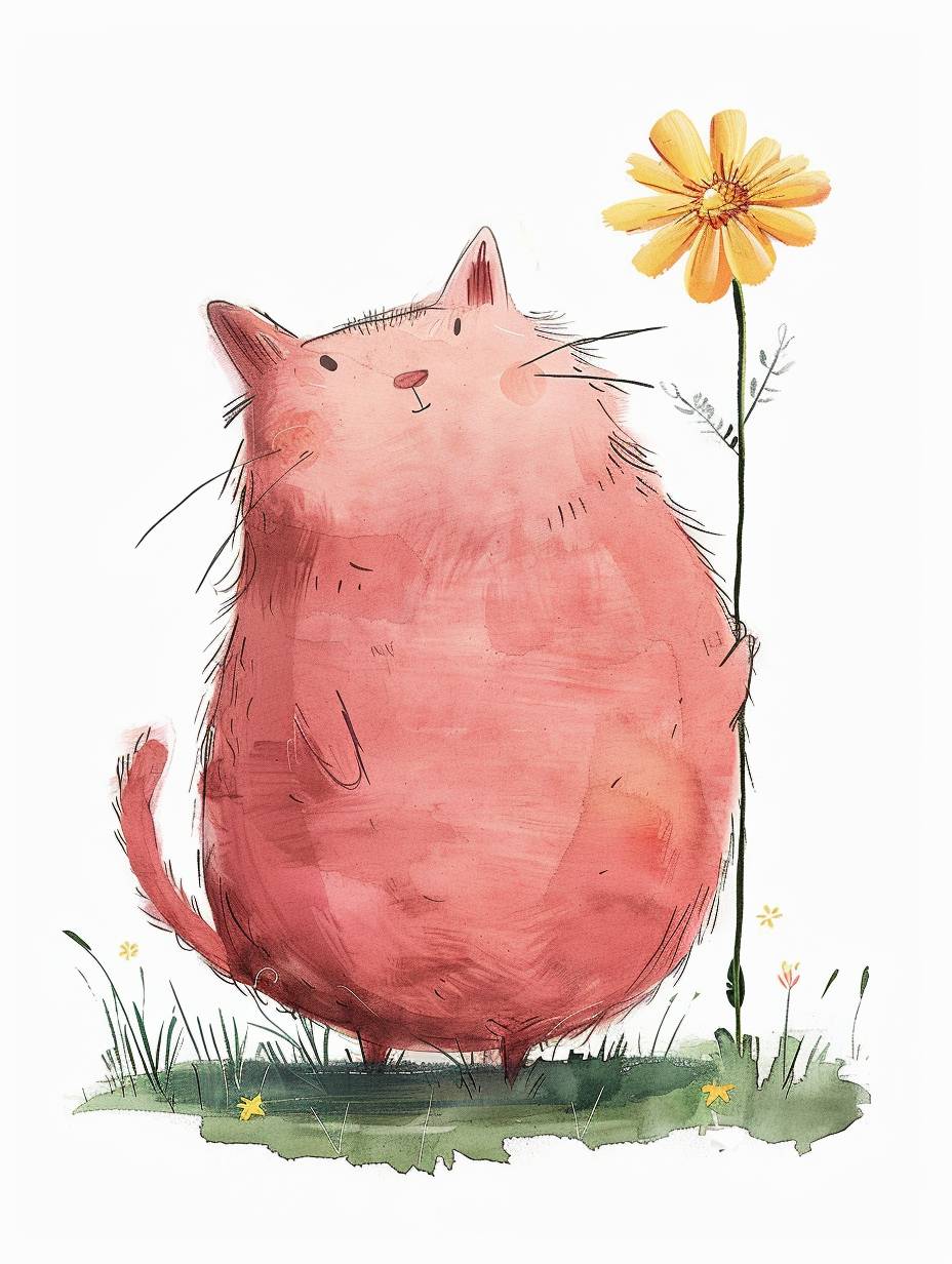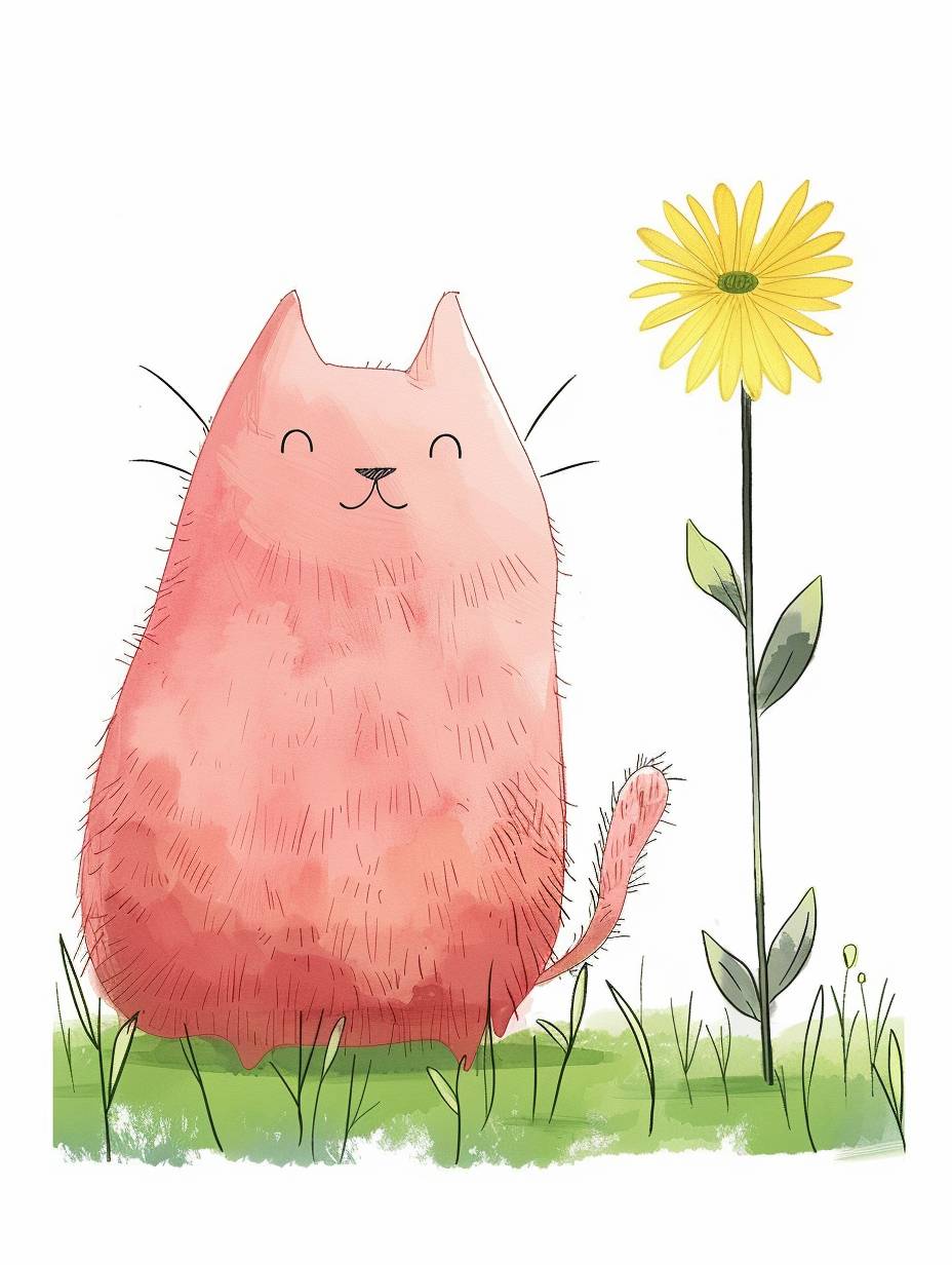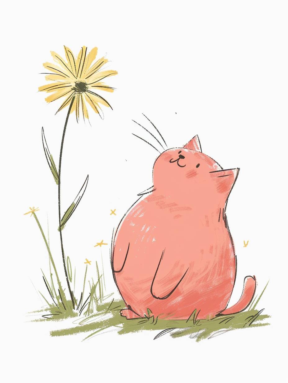 A cute pink cat with a big belly, standing on grass looking at a yellow flower, with a smiling face in the style of William Steig and Kestutis Kasparavicius. A simple minimalistic drawing with a white background and white space around the figure. --ar 3:4 --v 6.0