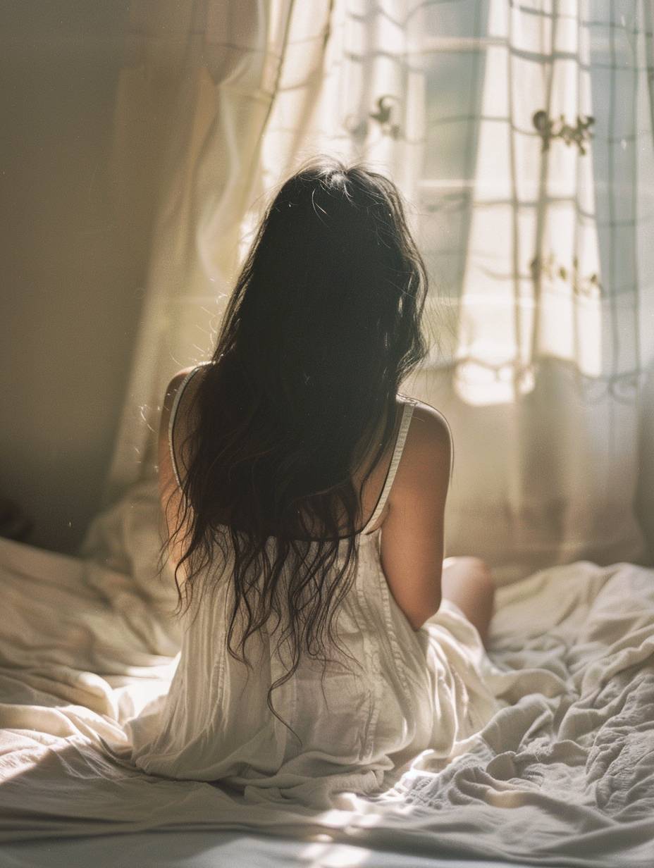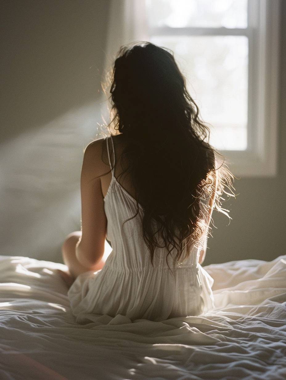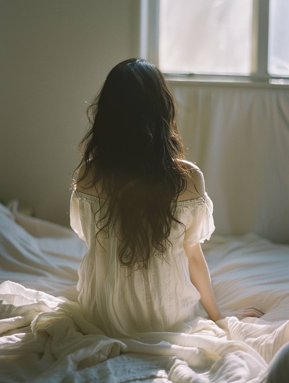 여성이 카메라에 등을 보이고 침대 가장자리에 앉아 있습니다. 그녀는 긴 검은 머리를 가지고 있으며, 흰색 린넨 드레스를 입고 있습니다. 뒤에서 촬영되었으며, 작은 창문에서 빛이 들어오고 부드러운 필름 사진입니다.