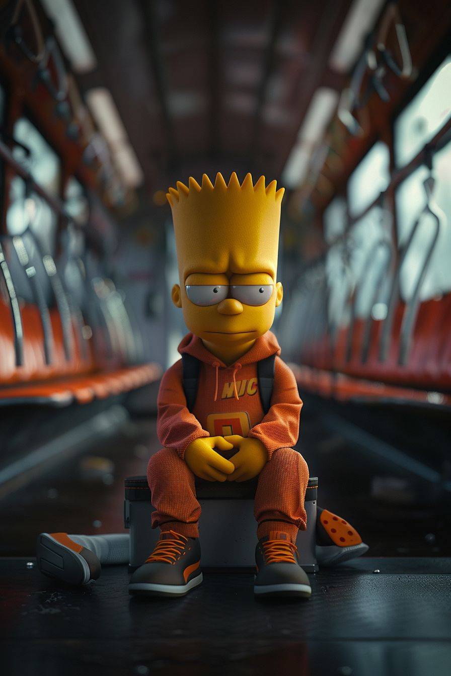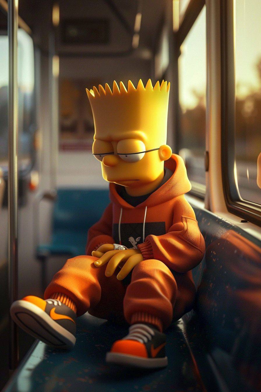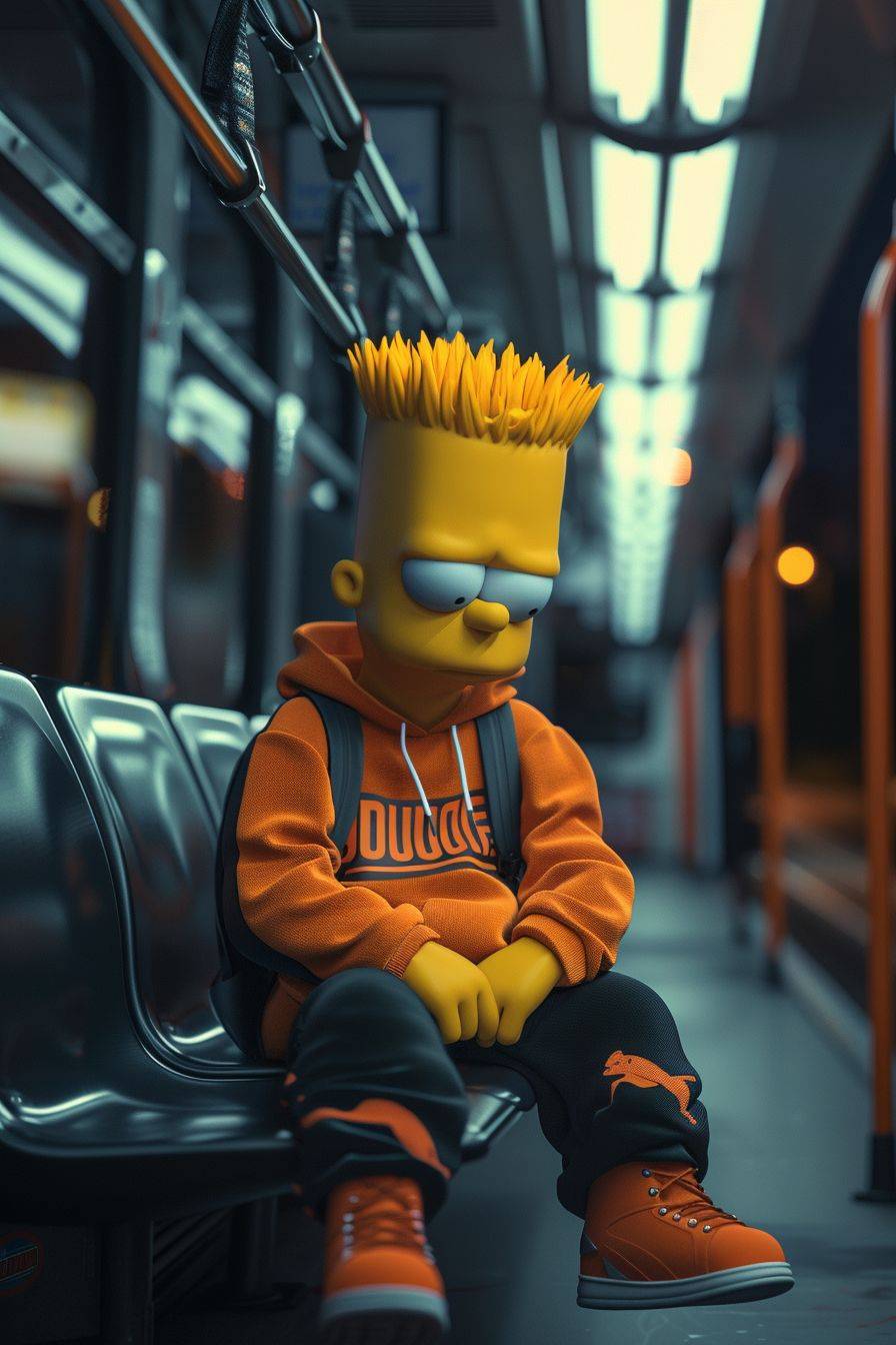 바트 심슨은 검정과 주황색 푸마 운동복을 입고, 슬프게 버스에 앉아 있습니다. 현실적인 모습이 언리얼 엔진 스타일처럼 보입니다.