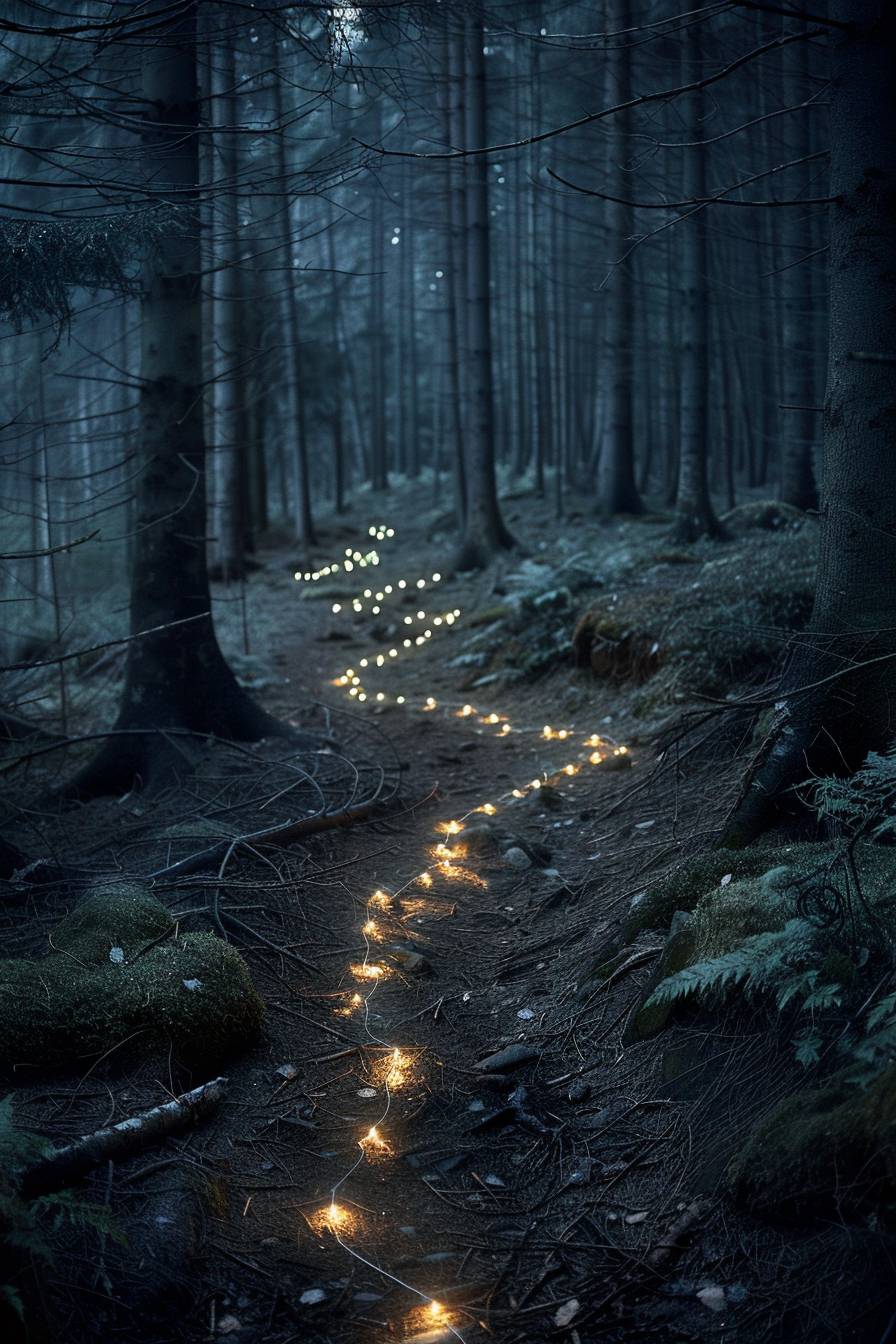 in style of Scarlett Hooft Graafland,Fairy lights leading the way through a dark forest --ar 2:3 --v 6.0