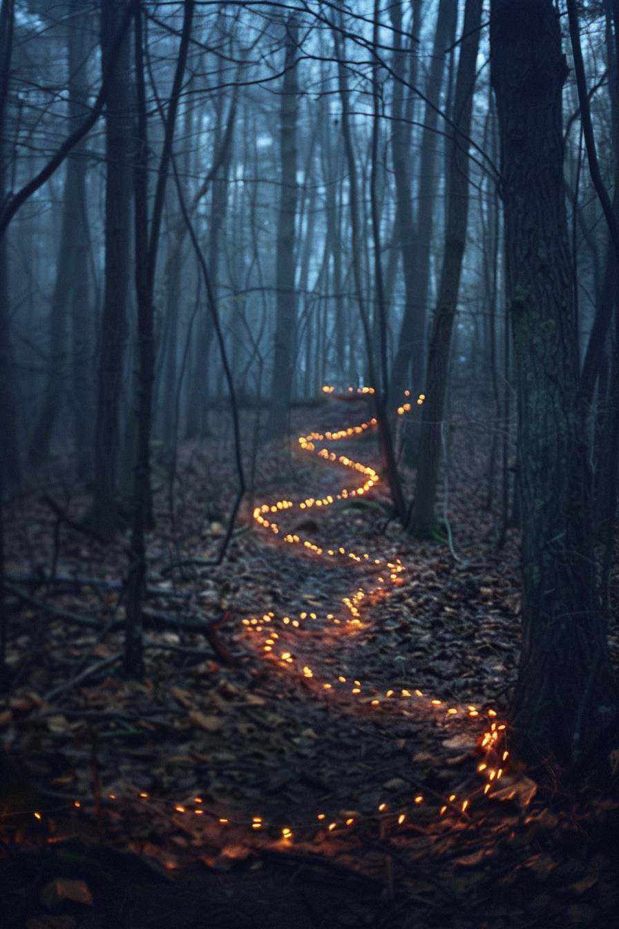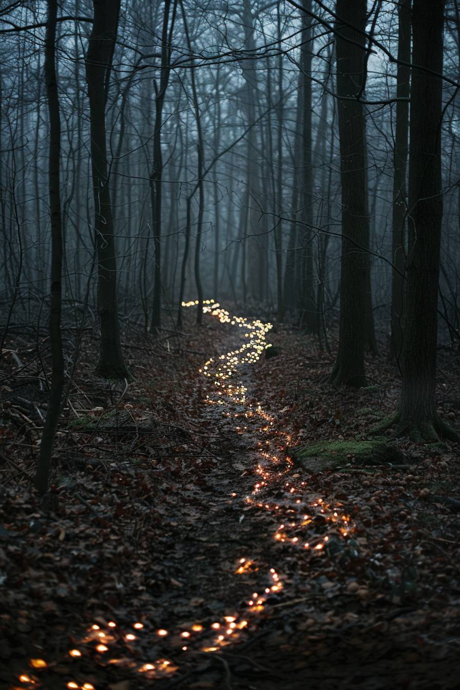 스칼렛 후프트 그라프란트의 스타일로, 어두운 숲을 통과하는 길을 안내하는 요정 조명.