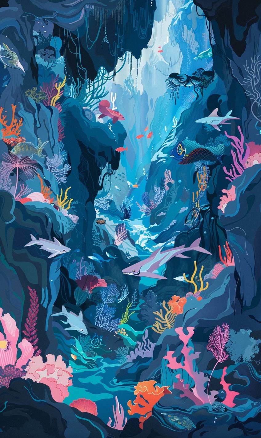 in style of Patrick Nagel,Underwater cavern with magical merfolk --ar 3:5 --v 6.0