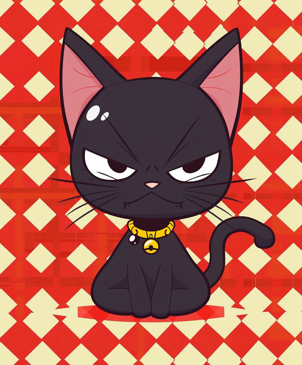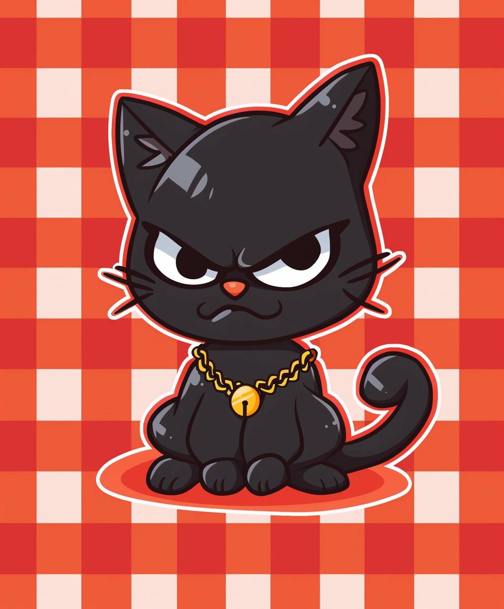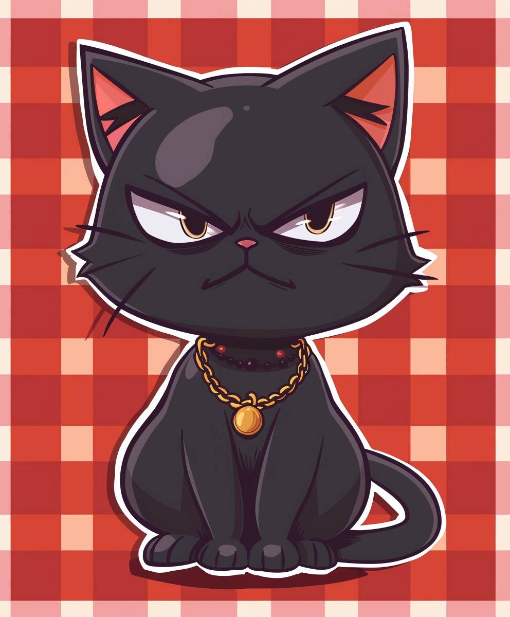A cute black cat with an angry expression on a red and white checkered background, wearing a gold necklace around its neck in the style of a cartoon. The drawing style is simple with a chibi character design and simple lines like sticker art on the right side of a grid pattern. --ar 5:6 --v 6.0
