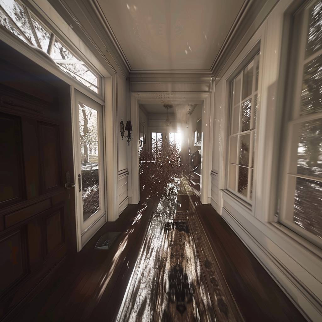 1인칭 시점이 집의 정문으로 빠르게 날아간다.