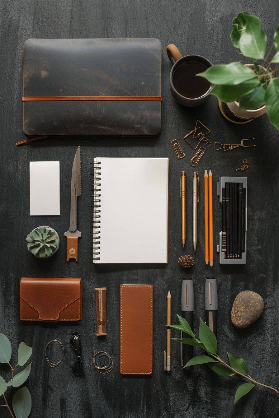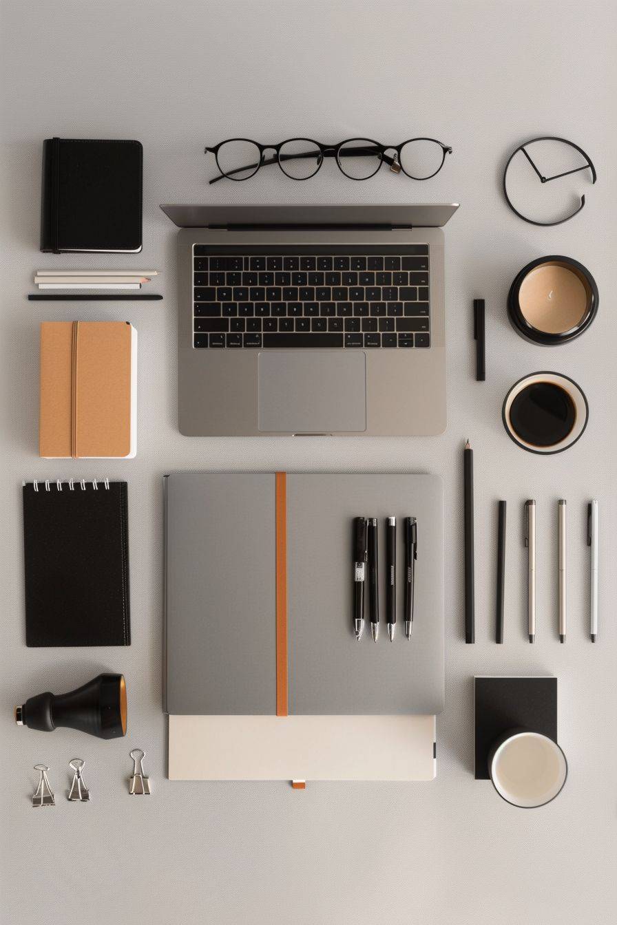 미니멀리스트 스타일의 사무용품, 노트북, 공책을 보여주는 평면 사진입니다.