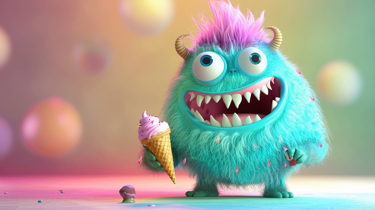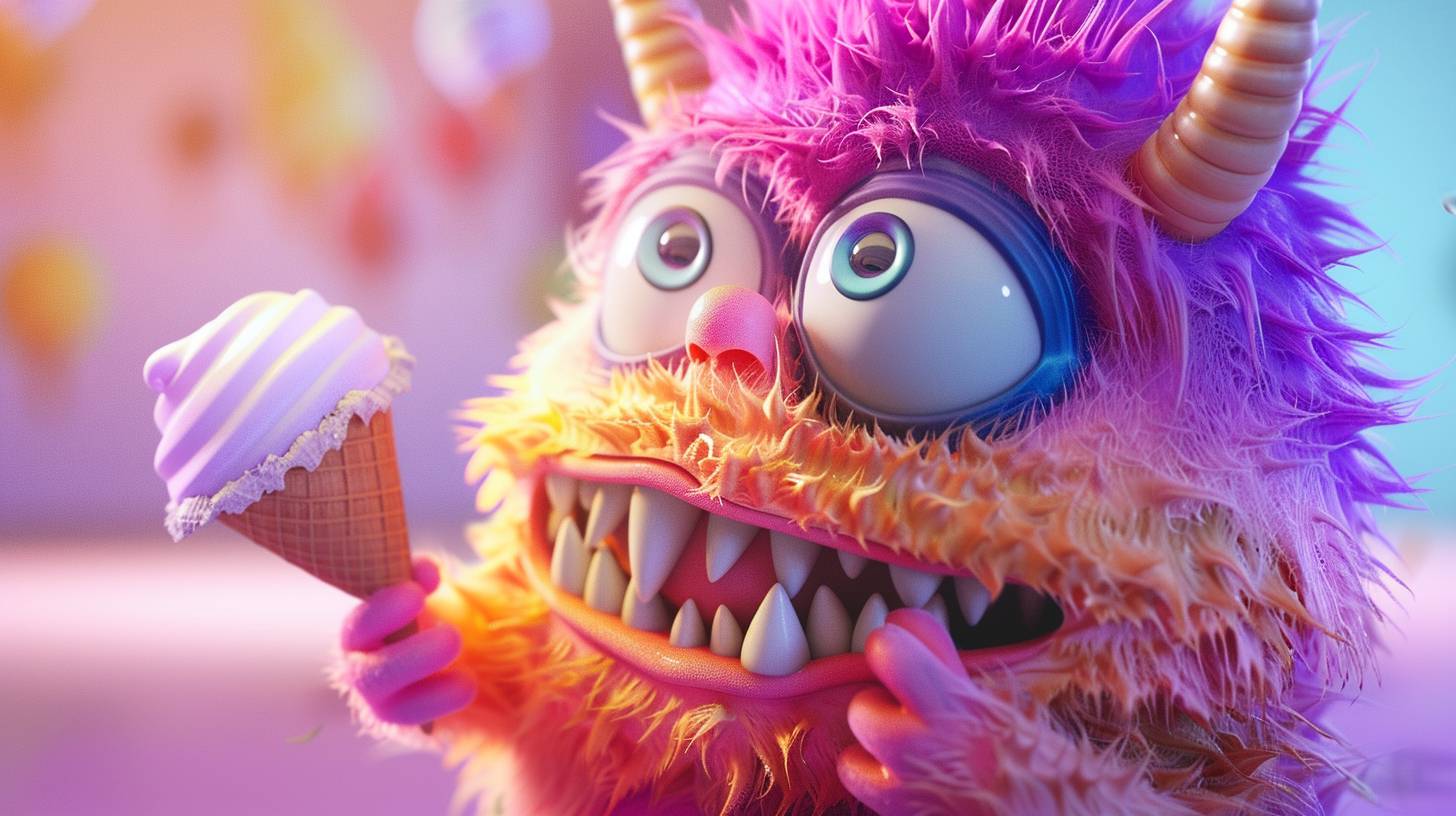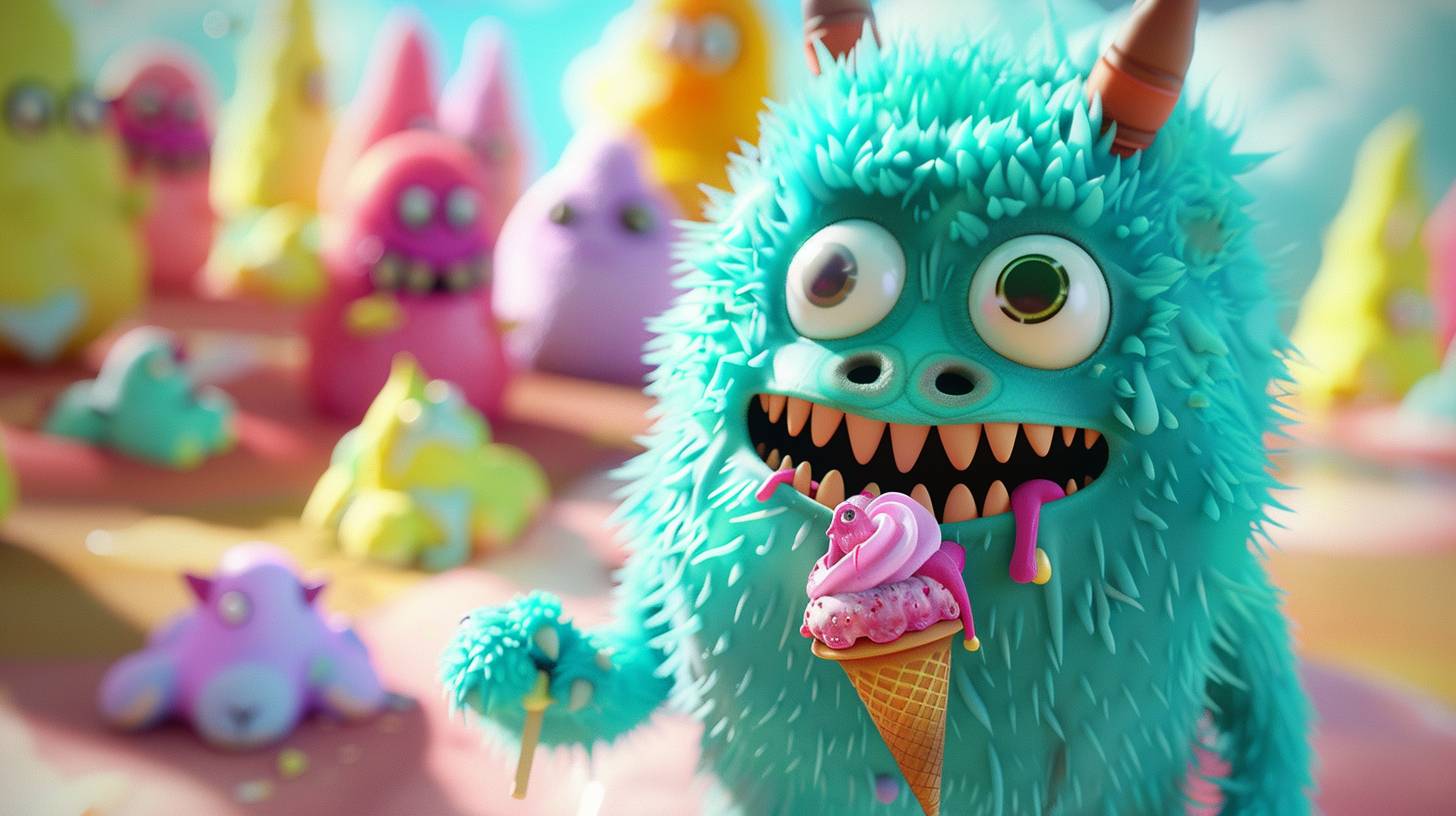 귀엽고 보송보송한 괴물이 아이스크림을 먹는 3D 만화 애니메이션, 선명한 색상