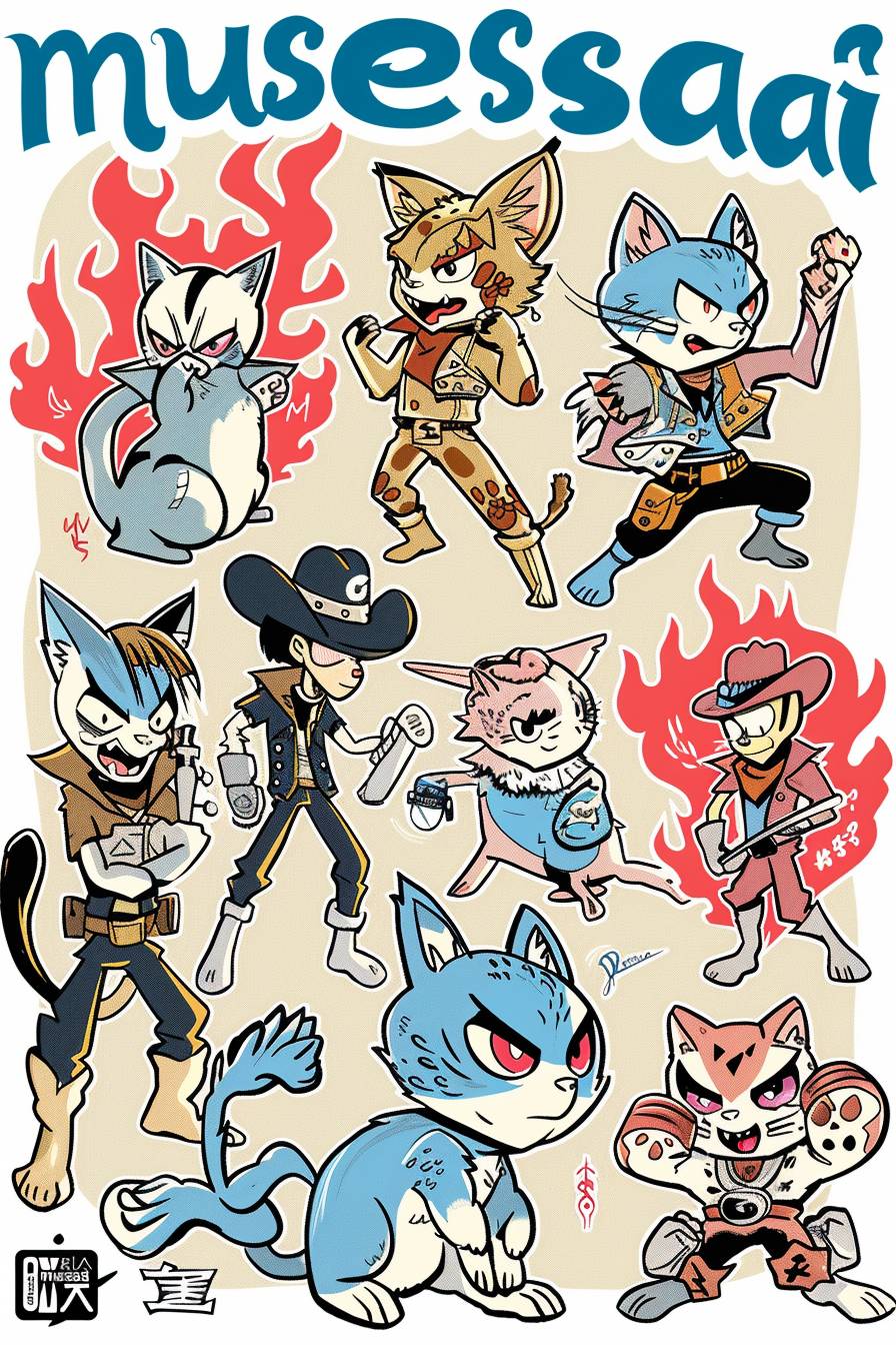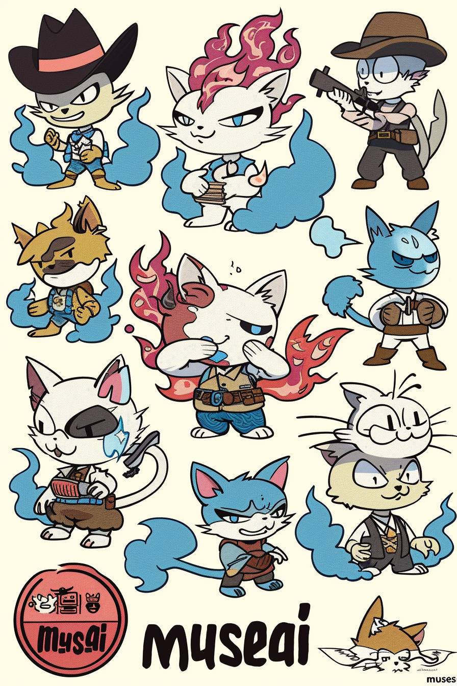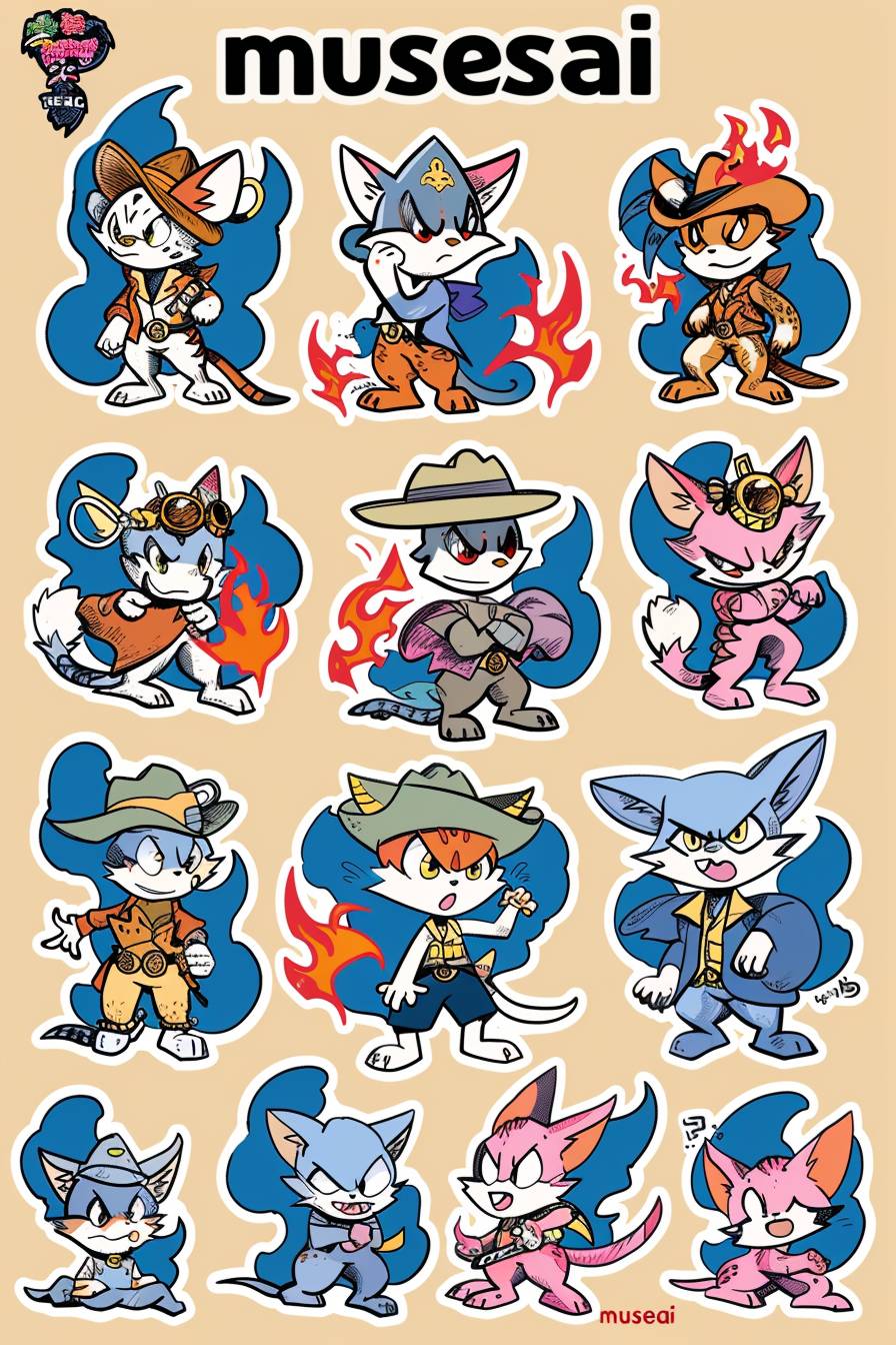 sticker sheet of various cartoon characters with the text "musesai". The first character is an anthropomorphic cat, second one has red flames on his head and wears cowboy, third ones have blue smoke around them wearing white gloves, fourth characters wear pink armor in front of their chest, sticker design in the style of Peter Bagge --ar 2:3 --v 6.0