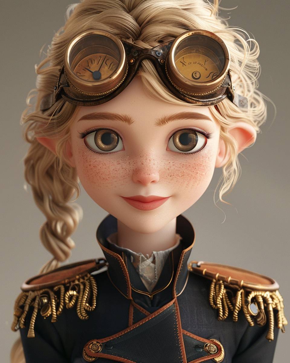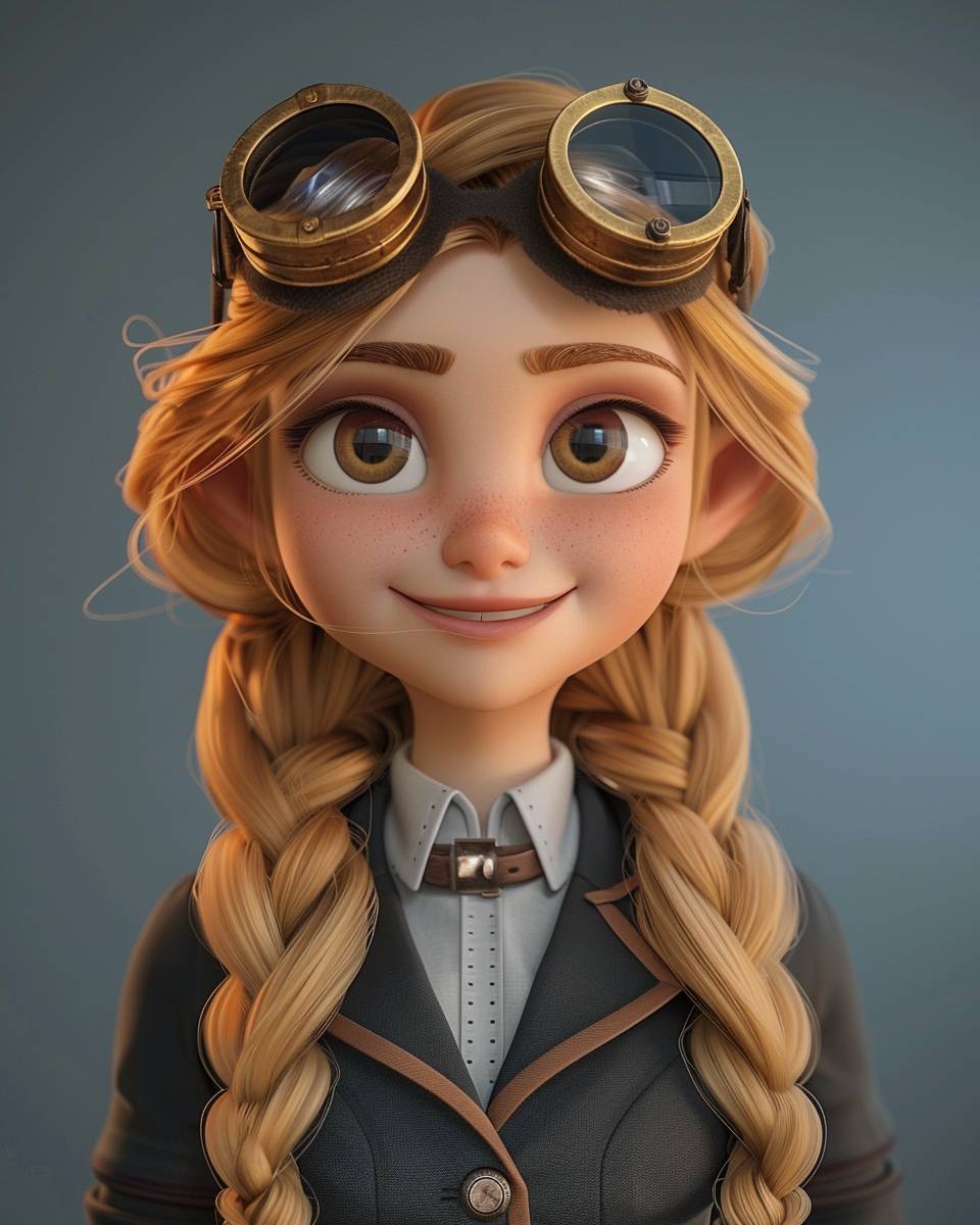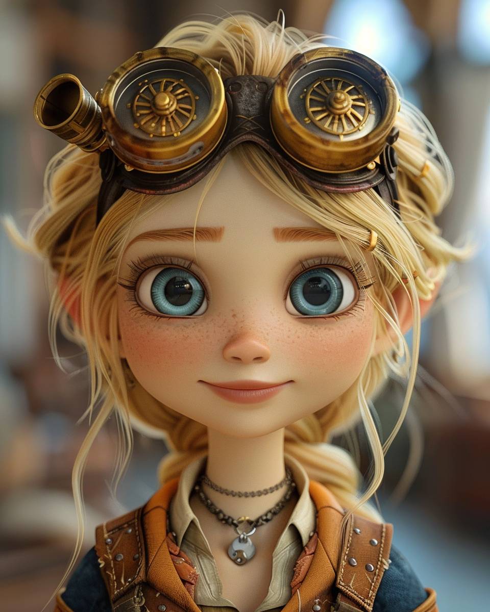 디즈니 스타일의 3D 카툰 애니메이션으로 스팀펑크 고글을 착용한 행복한 젊은 여성 마법사.