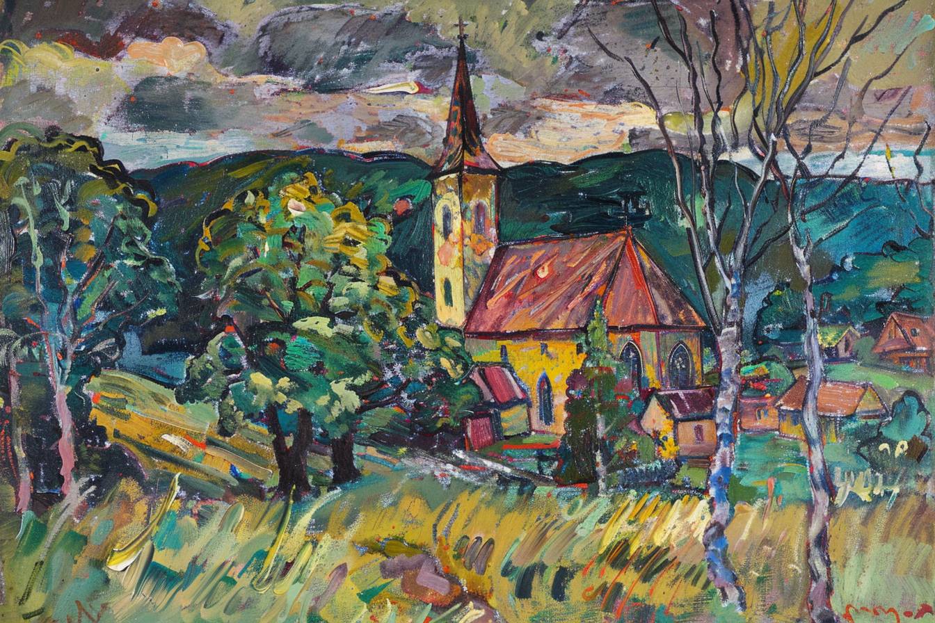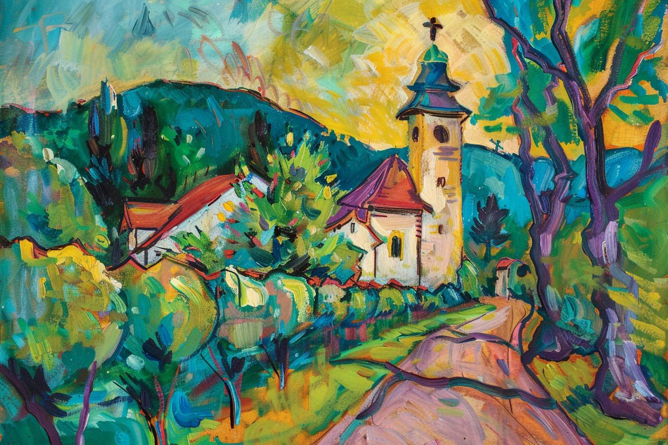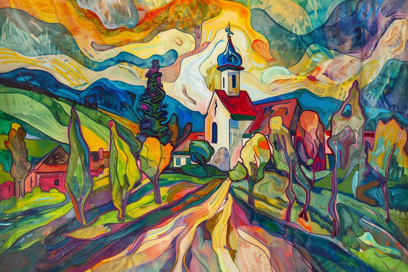 in style of Erich Heckel, stunning natural landscape, church --ar 3:2 --v 6.0