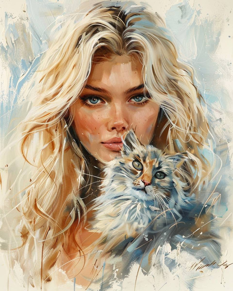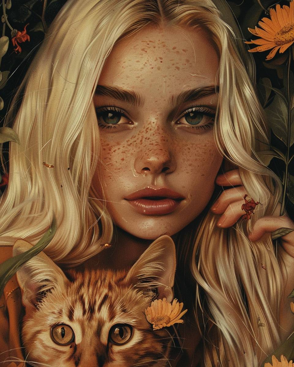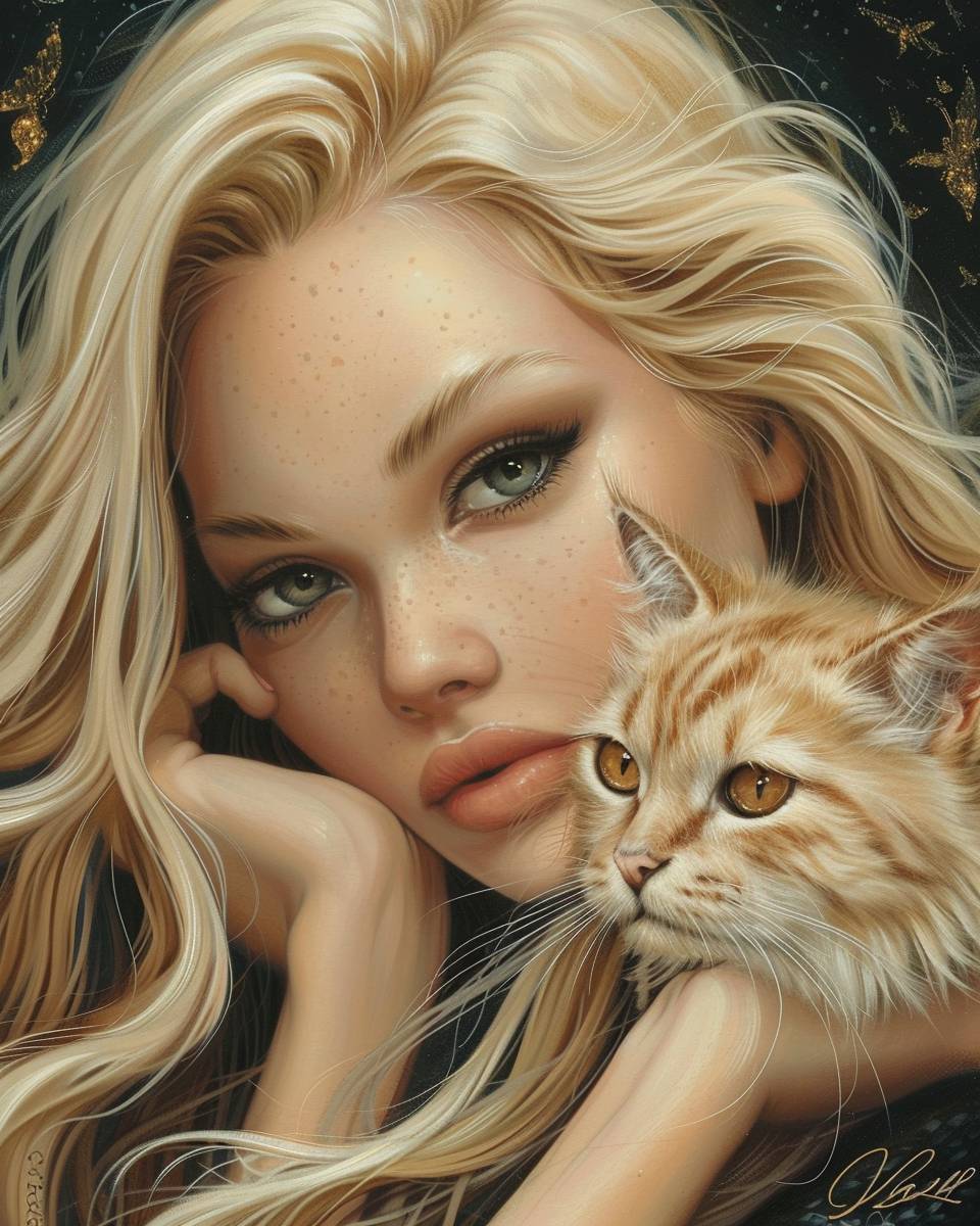 poster of a cat picture of blonde woman. --ar 4:5 --v 6.0