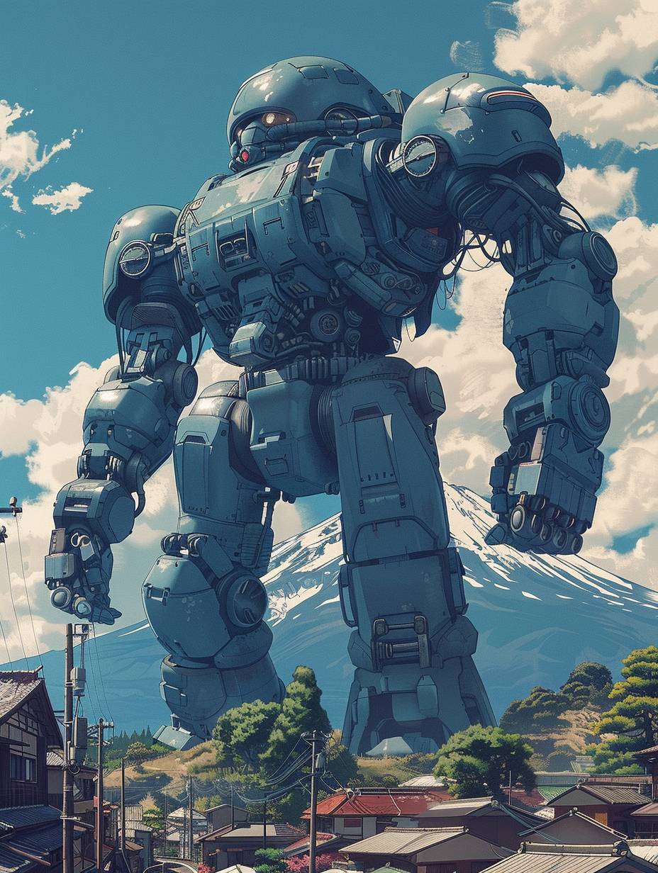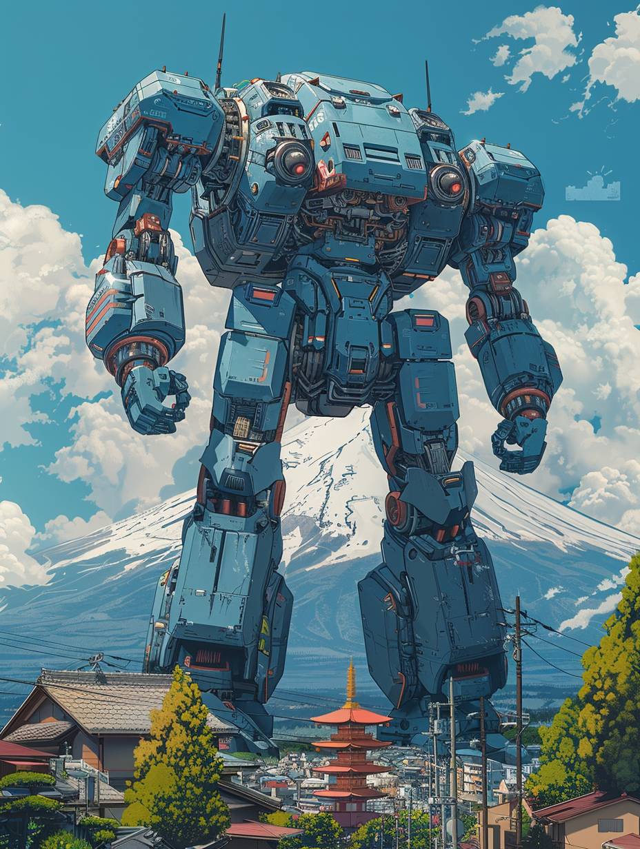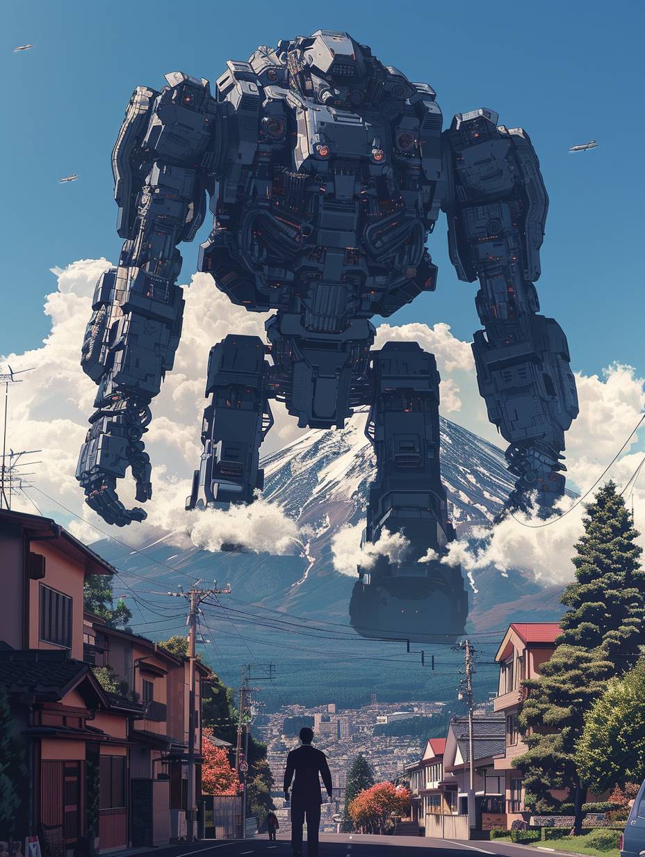 Shadowed lighting view photograph of gigantic mecha looming over Mount Fuji on sunny day,Colossal scale,by Adrian Tomine and moebius with Mix styles,Ultra-detailed details,color art,High resolution,8K,UHD --ar 3:4 --stylize 200 --v 6.0