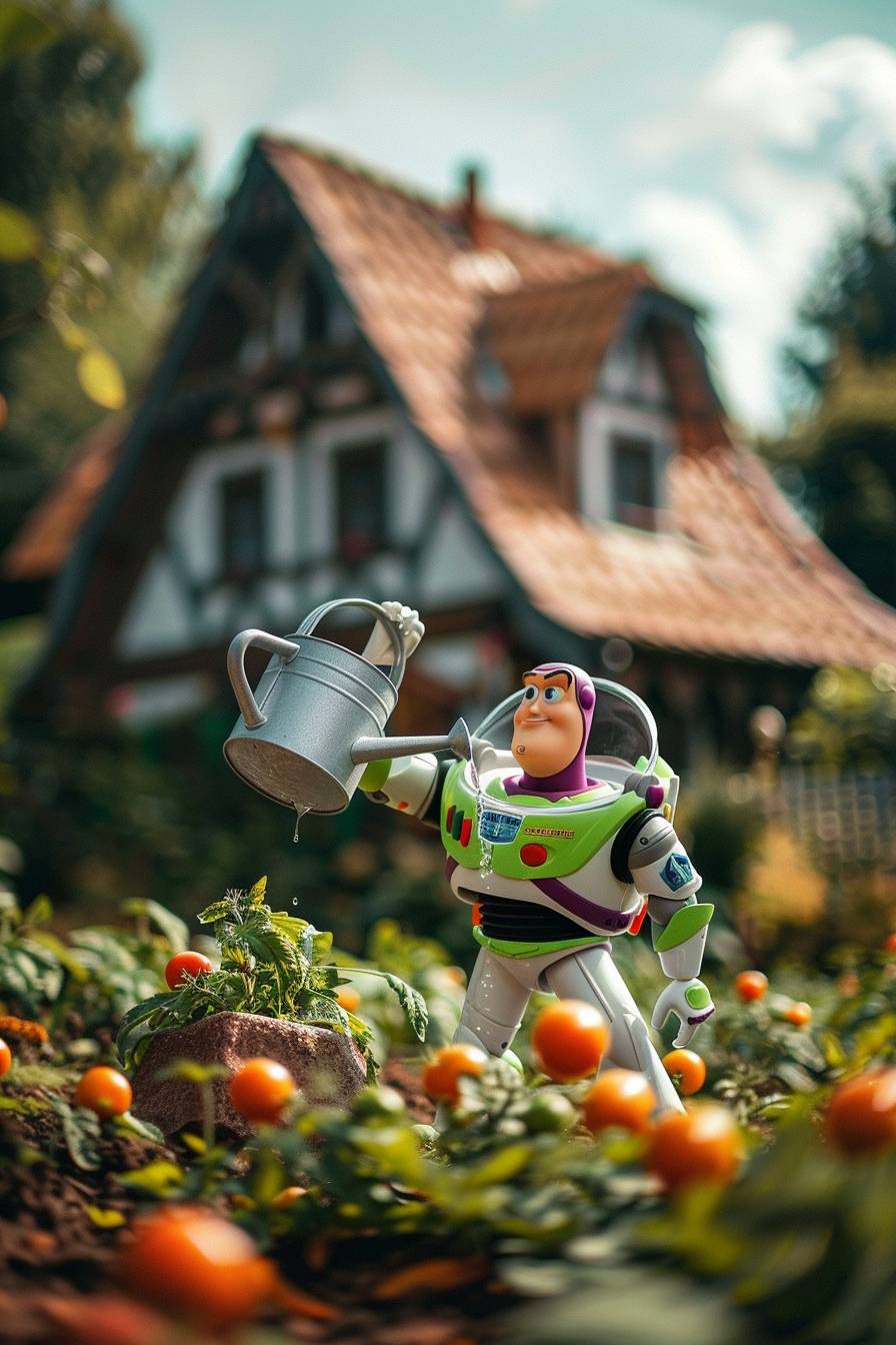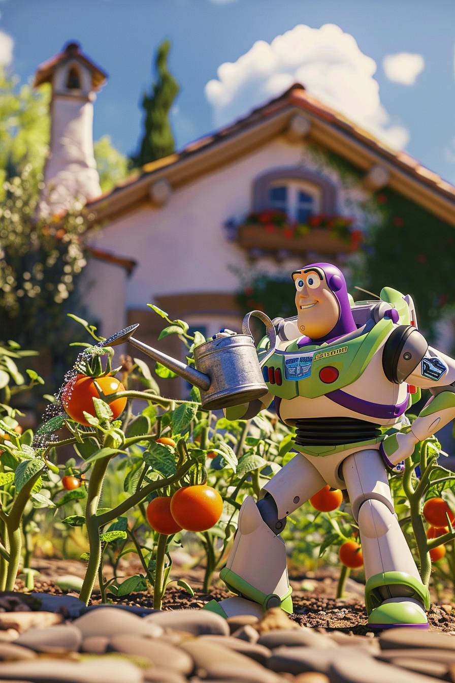 버즈 라이트이어가 아름다운 시골 집 뒤에서 물을 주고 있다.