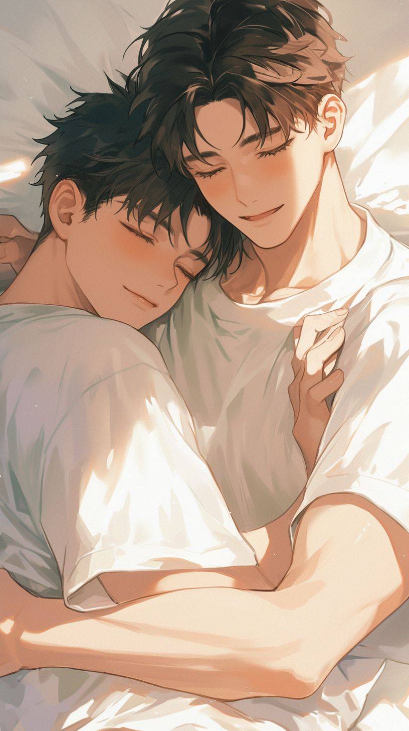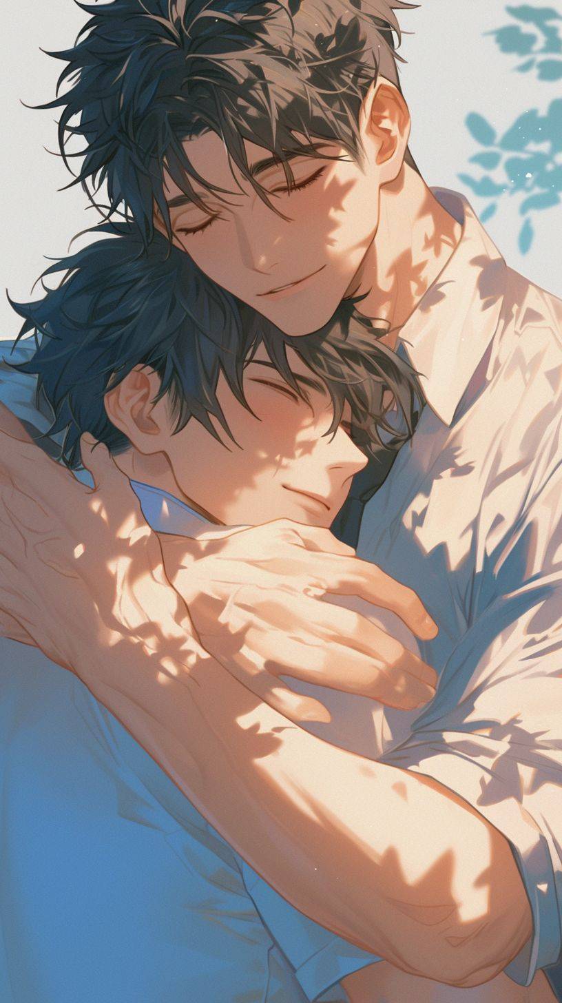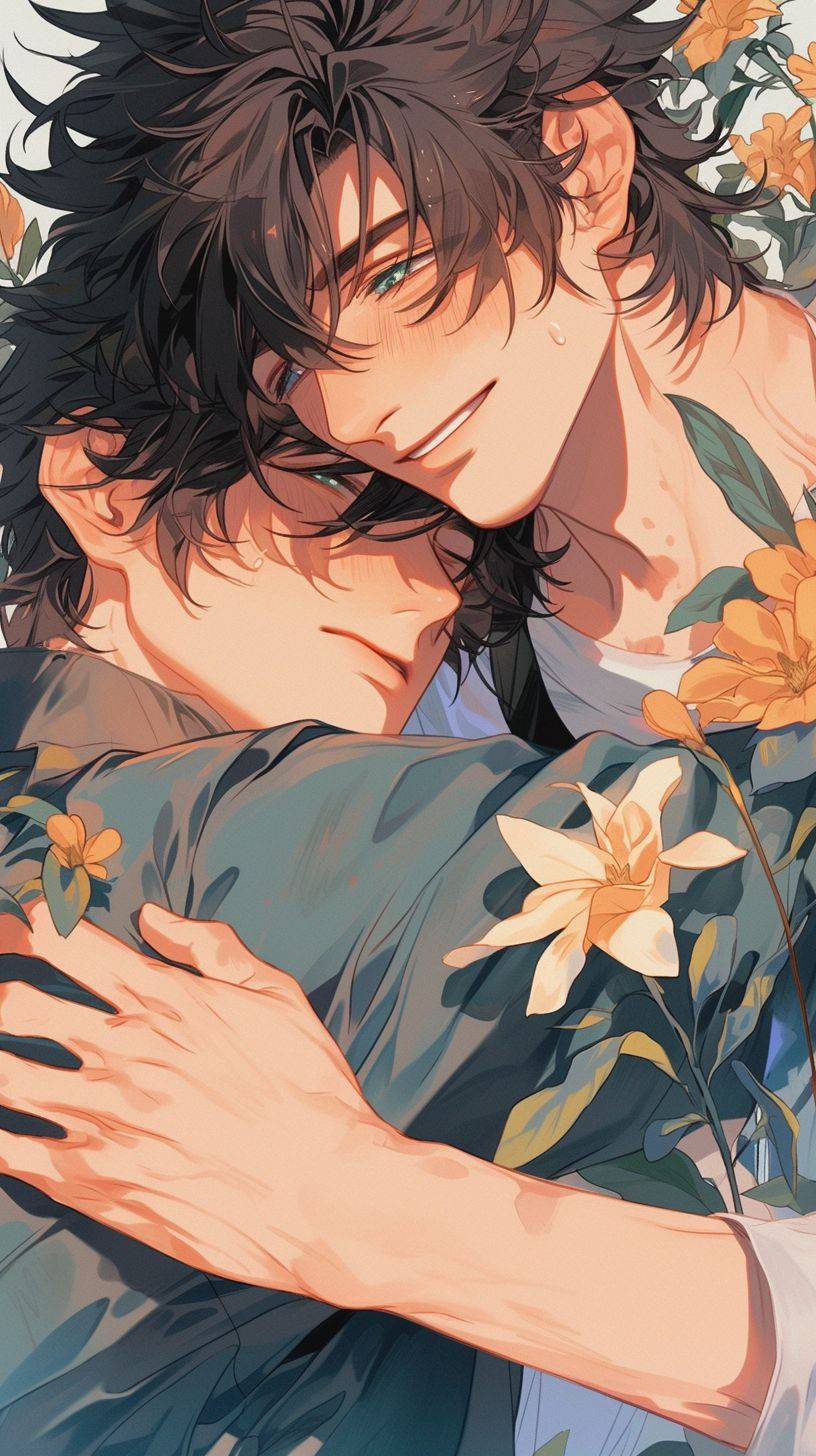 남자들 사이의 사랑 관계, 두 소년이 따뜻하게 포옹하며 달콤한 미소를 지으며 부드러운 눈빛, 젊은 활력을 가지고 있습니다. 4개의 팔과 20개의 손가락이 있으며, 추가적인 팔이나 손가락은 없습니다. 8K 이미지 품질
