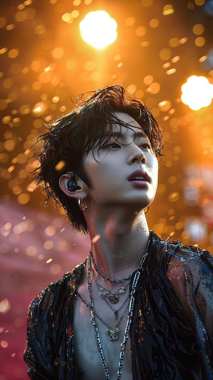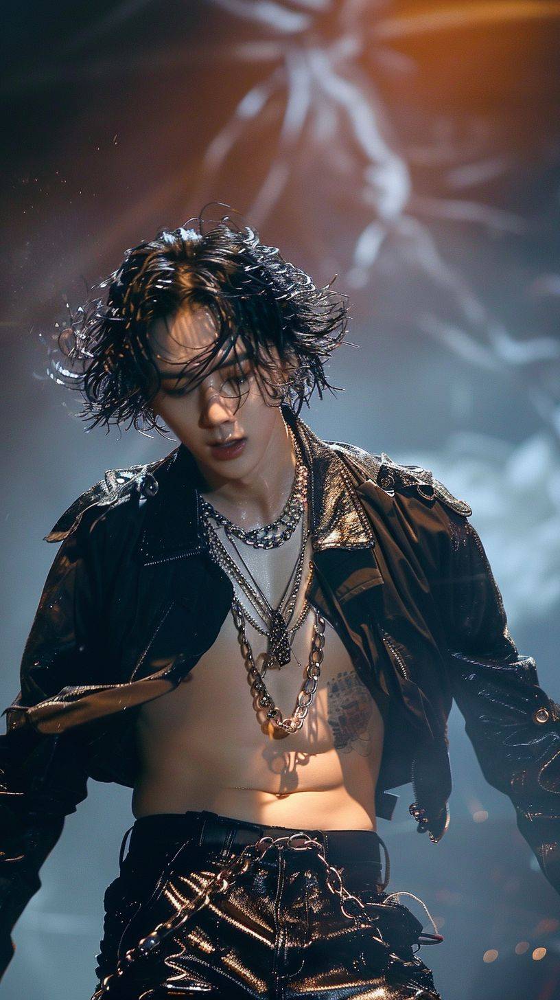 한국 남자 아이돌이 무대에서 춤추고 있어요, 땀과 완벽한 표정.