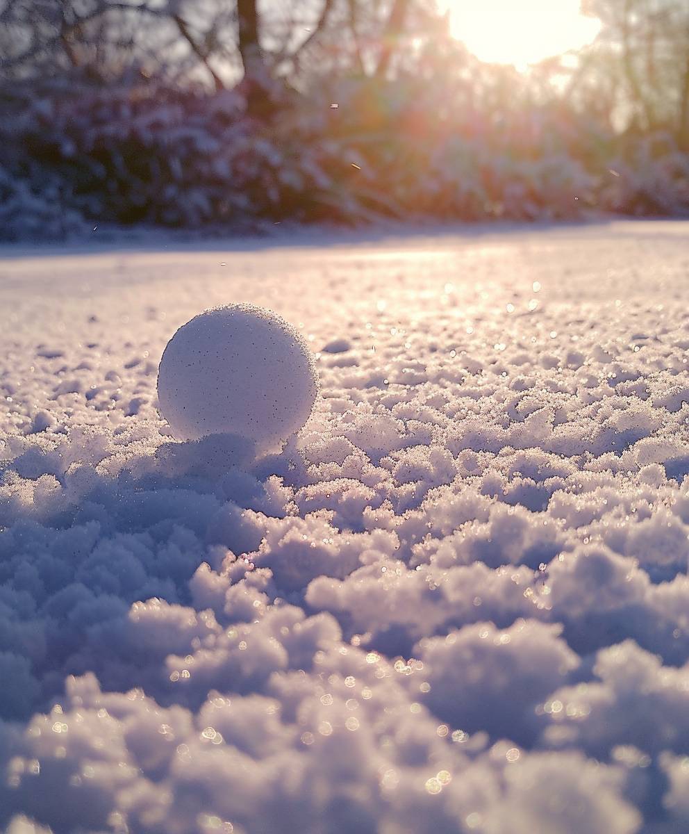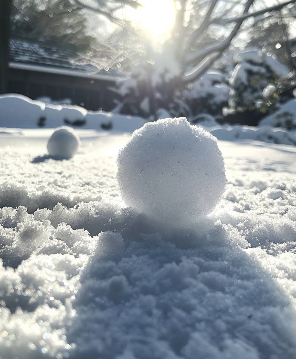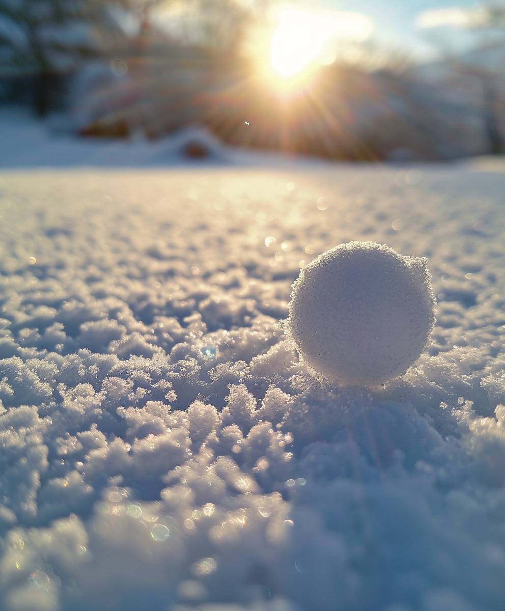땅 위에서 구르는 눈덩이, 배경은 흰 눈으로 덮여 있고 그 뒤에서 햇빛이 비치고 있습니다. 이 사진은 아이폰 카메라로 촬영되었습니다. 하나의 눈덩이만을 클로즈업한 사진으로, 눈덩이는 두 개의 작은 공처럼 보이며, 그 그림자가 눈 위에 드리워져 있습니다. 다른 물체나 사람은 보이지 않아야 합니다. 일반적으로 초점은 그림의 상단 절반에 맞춰져 있으며, 아이폰 카메라 스타일입니다.