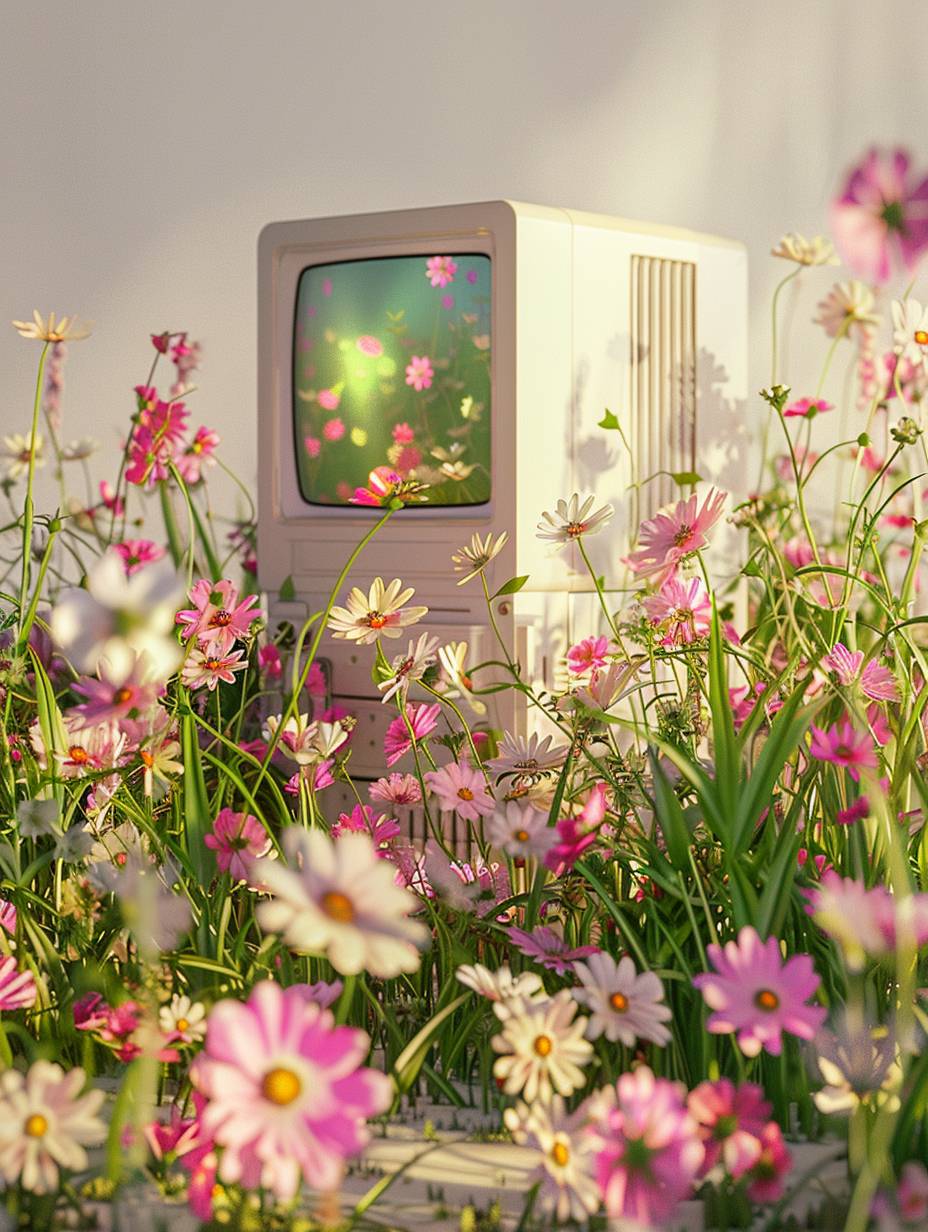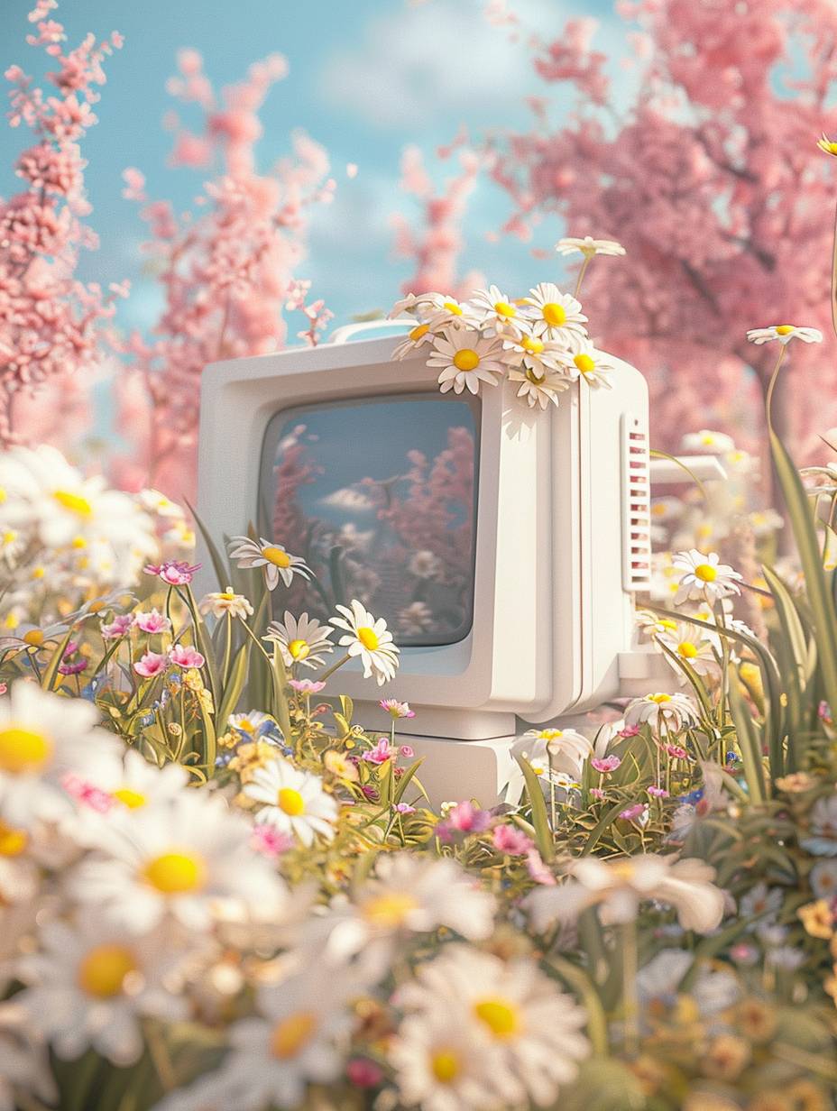 하얀 컴퓨터에서 꽃들이 자라났고, 꽃과 풀에 둘러싸여 있으며, Cinema4D 렌더링과 클레이 조각 스타일, 귀여운 미학, 봄 정원, 밝은 색상, 꿈 같은 분위기, 밝은 낮에 만개하는 색, 가상 현실, 판타지 세계를 보여줍니다.