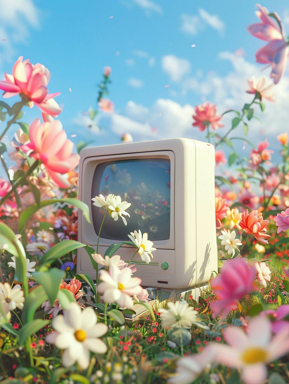 Flowers grew out of a white computer, surrounded by flowers and grass in the style of cinema4d rendering and in the style of clay sculpture, kawaii aesthetic, spring garden, bright colors, with a dreamy atmosphere, blooming colors in bright daylight, virtual reality, fantasy world. --ar 3:4 --style raw --v 6.0
