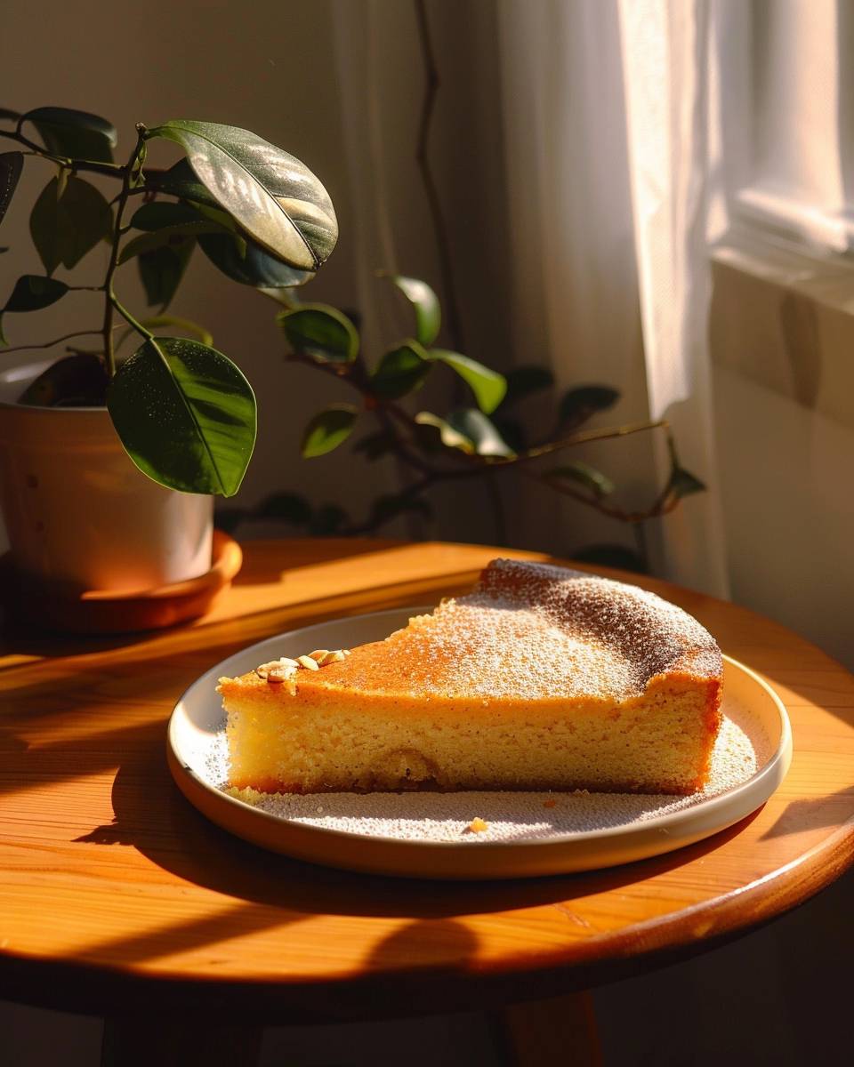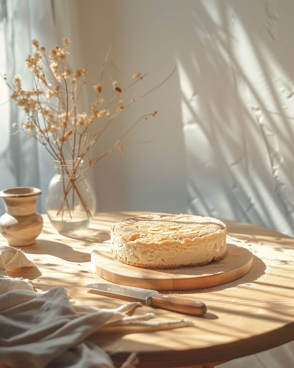 사진 음식 스타일링, 매크로 클로즈업 샷: 나무 테이블 위의 아몬드 오렌지 케이크, 보헤미안 장식, 베이지 색상, 아침 조명 + 그림자, 코닥 포트라 400